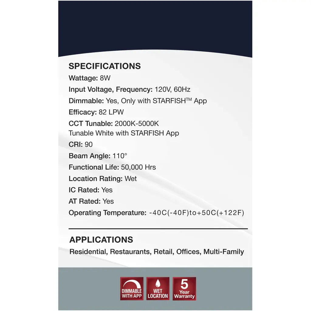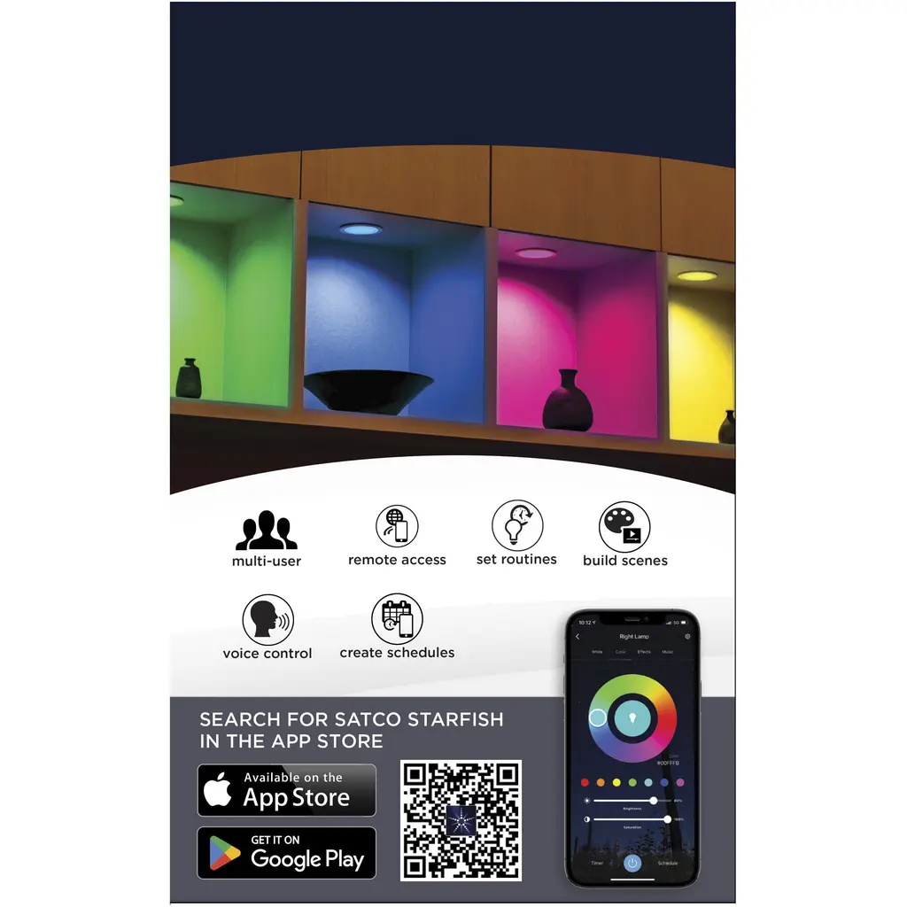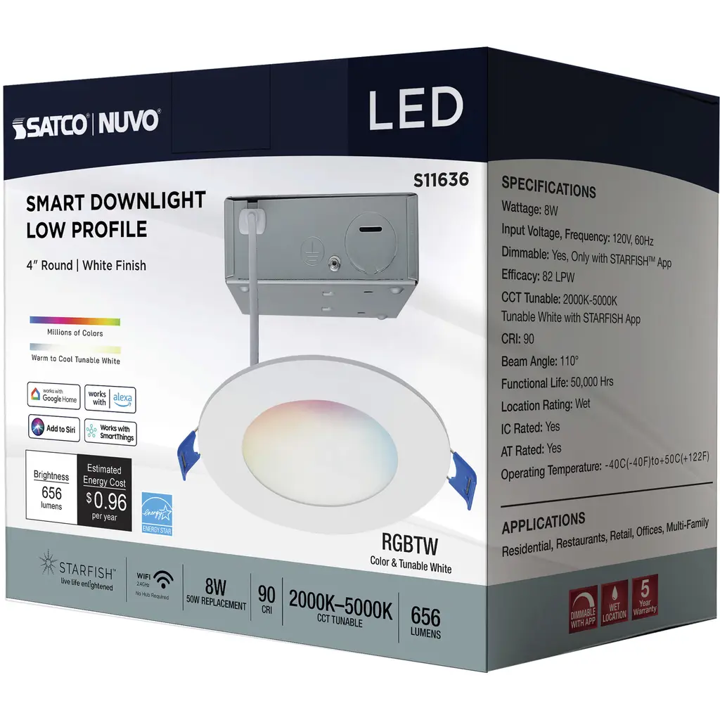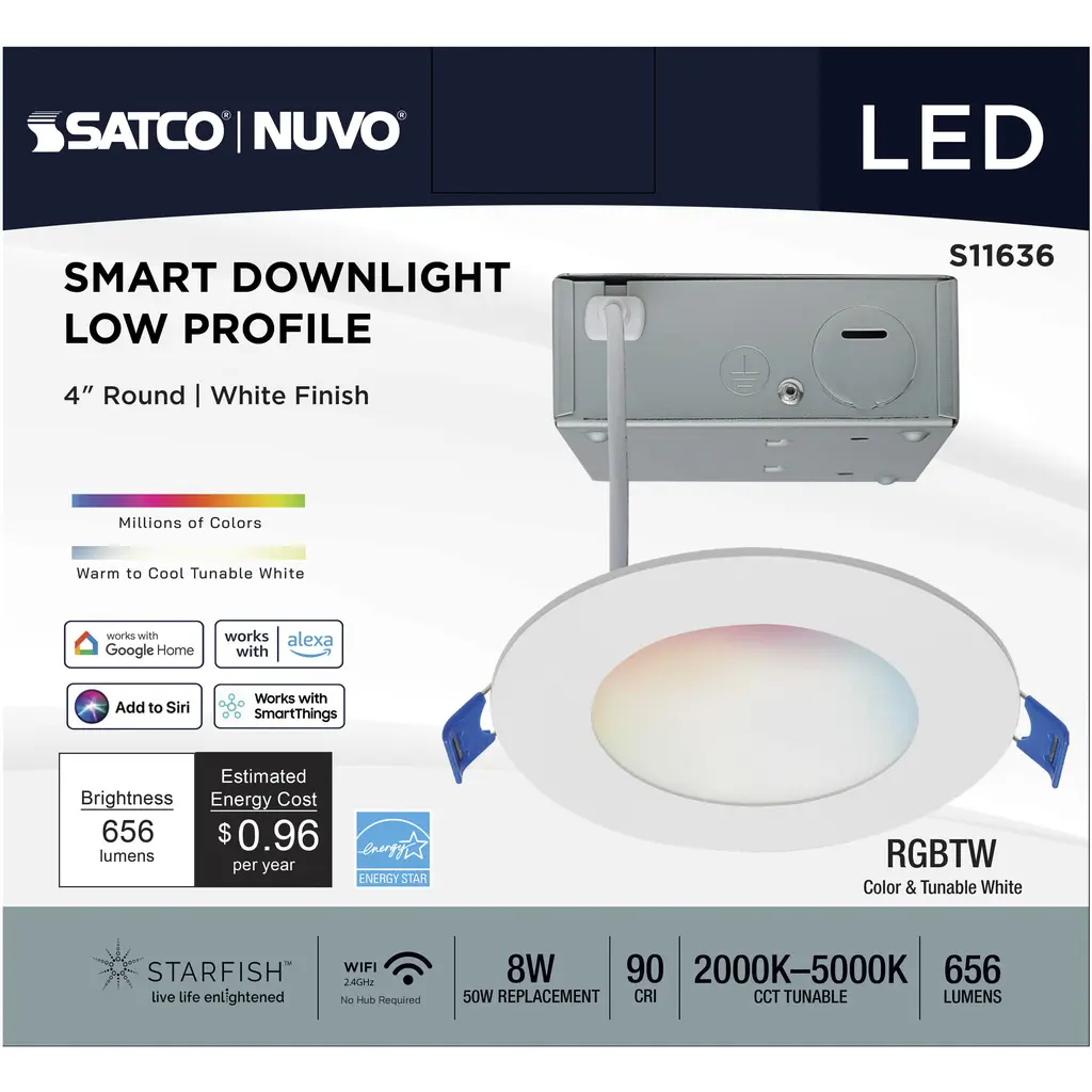 SATCO NUVO'S S11636 4-inch LED Slimfit Downlights with STARFISH technology are the ultimate choice for smart lighting and ambiance control. Download the STARFISH app to customize any tunable white color temperatures from 2000K warm white light to 5000K natural light, or choose from millions of colors on the RGB spectrum, all from your mobile device. Offered in round with flat lens, these slimfit downlights are ideal for transforming residentialand multifamily environments. These downlights are also compatible with Siri, Alexa, Google Home, and SmartThings so they can be easily incorporated into your smart home.