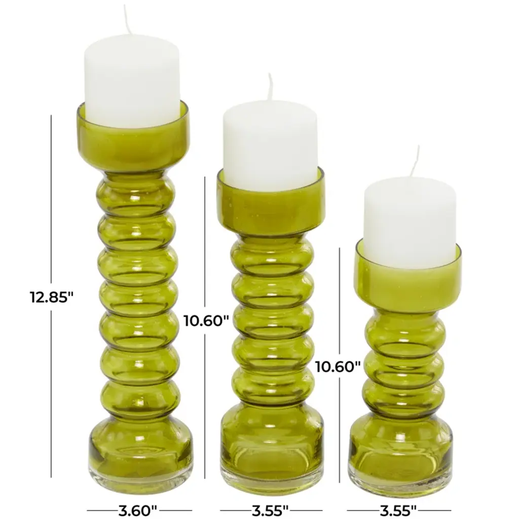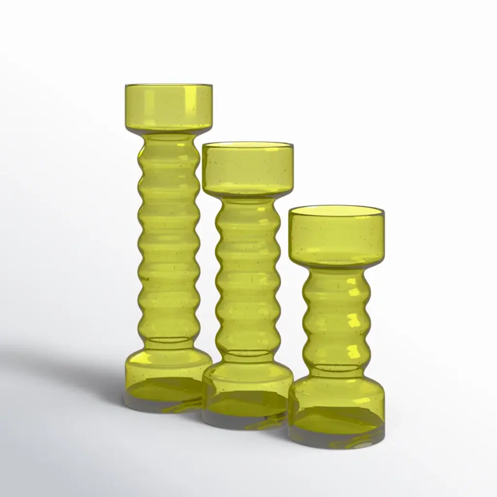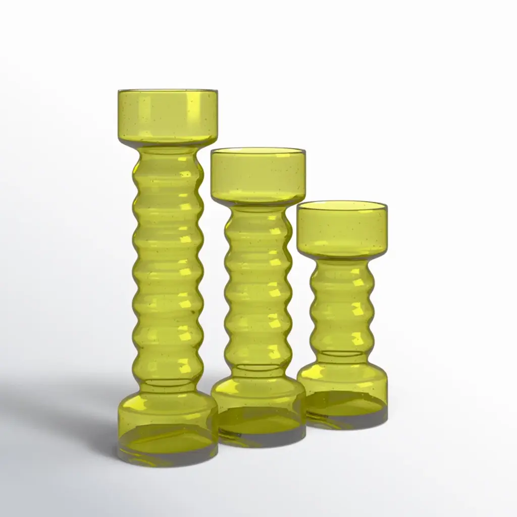Display these glass candle holders as a set or as individual decor pieces to complement your console table and simplistic vases in your modern living room space. Designed with felt or rubber stoppers at the base that prevent scratching furniture and table tops, as well as sliding around. Can hold 3 pillar candles, not included. This item ships in 1 carton. Glass candle holder makes a great gift for any occasion. Suitable for indoor use only. This item ships fully assembled in one piece. Made in India. This yellow colored candle stand comes as a set of 3. Modern style.
