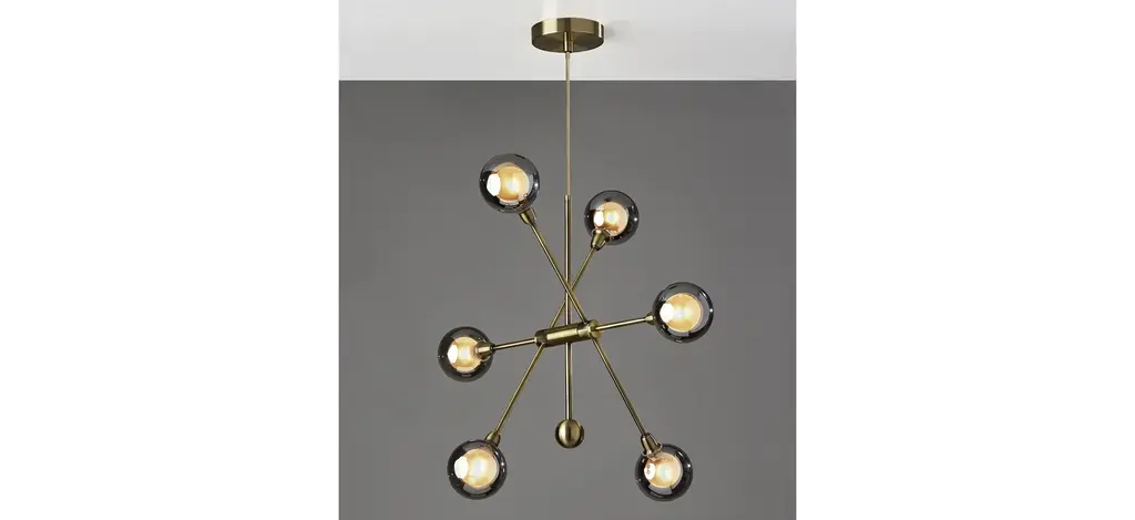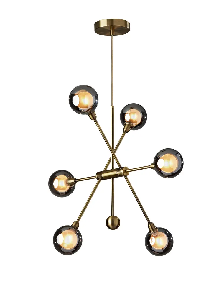 Add a fun and unique addition to entryways, kitchens, dining areas, and more with the Starling LED 6 Light Chandelier Hanging Lamp. The antique brass finish on this 24" tall chandelier contrasts with the 4" diameter Sputnik-style shades. Made of double-layer glass, the 6 shades are frosted on the inside but smoked on the outside for a unique look, while the included 3W LED bulbs are dimmable so you can easily adjust the lighting level. For added versatility, the angle of the light stems is adjustable, allowing you to create a look all your own. The antique brass stem leads to a matching 5" diameter base, and the chandelier features a 72" gold fabric cord, allowing you to adjust the light's height to suit the needs of any room regardless of the ceiling height.