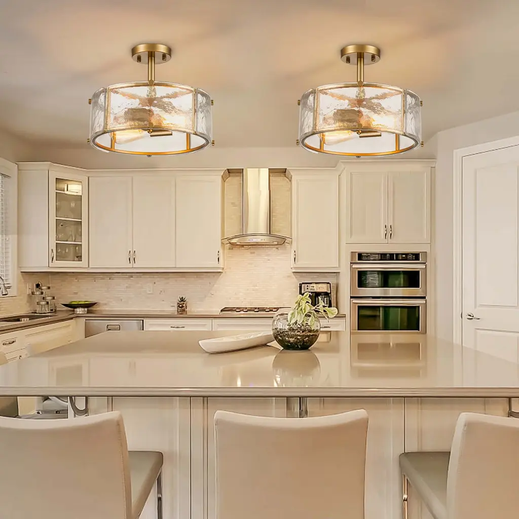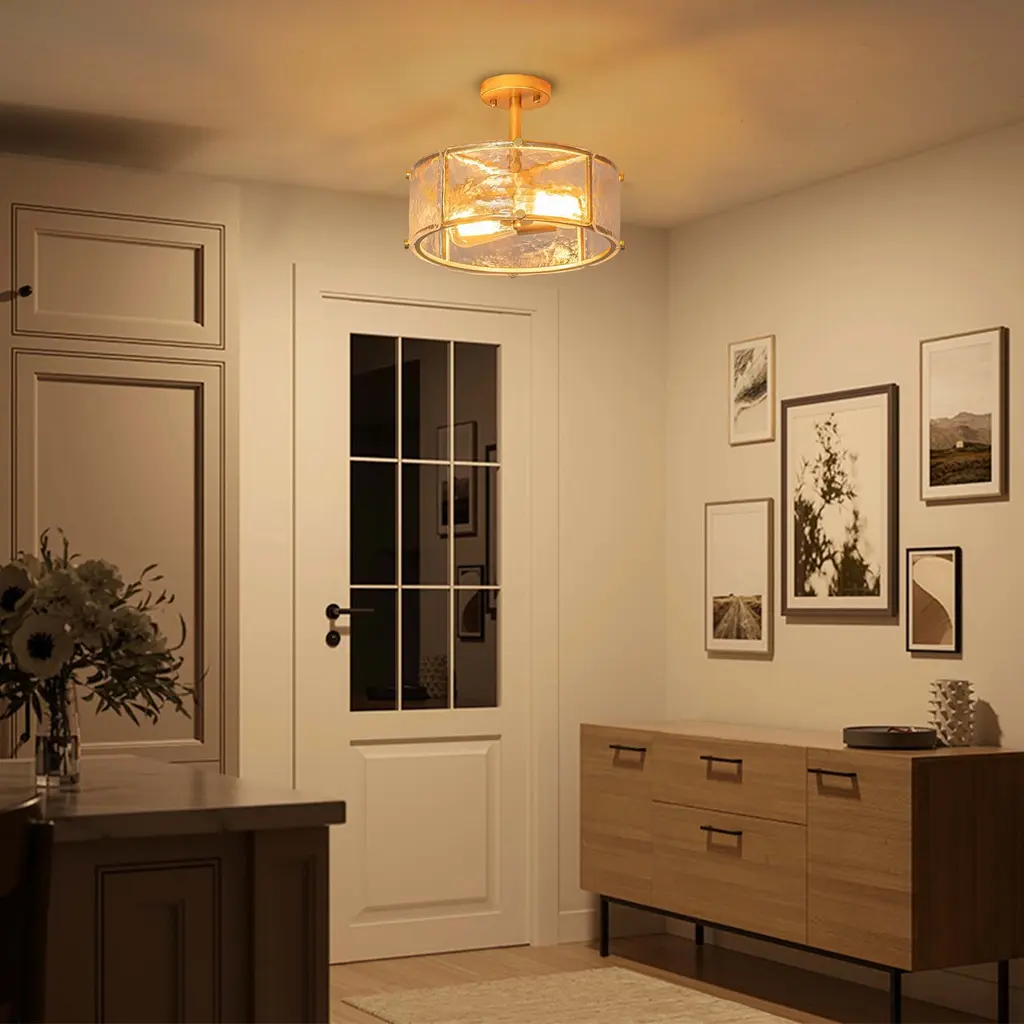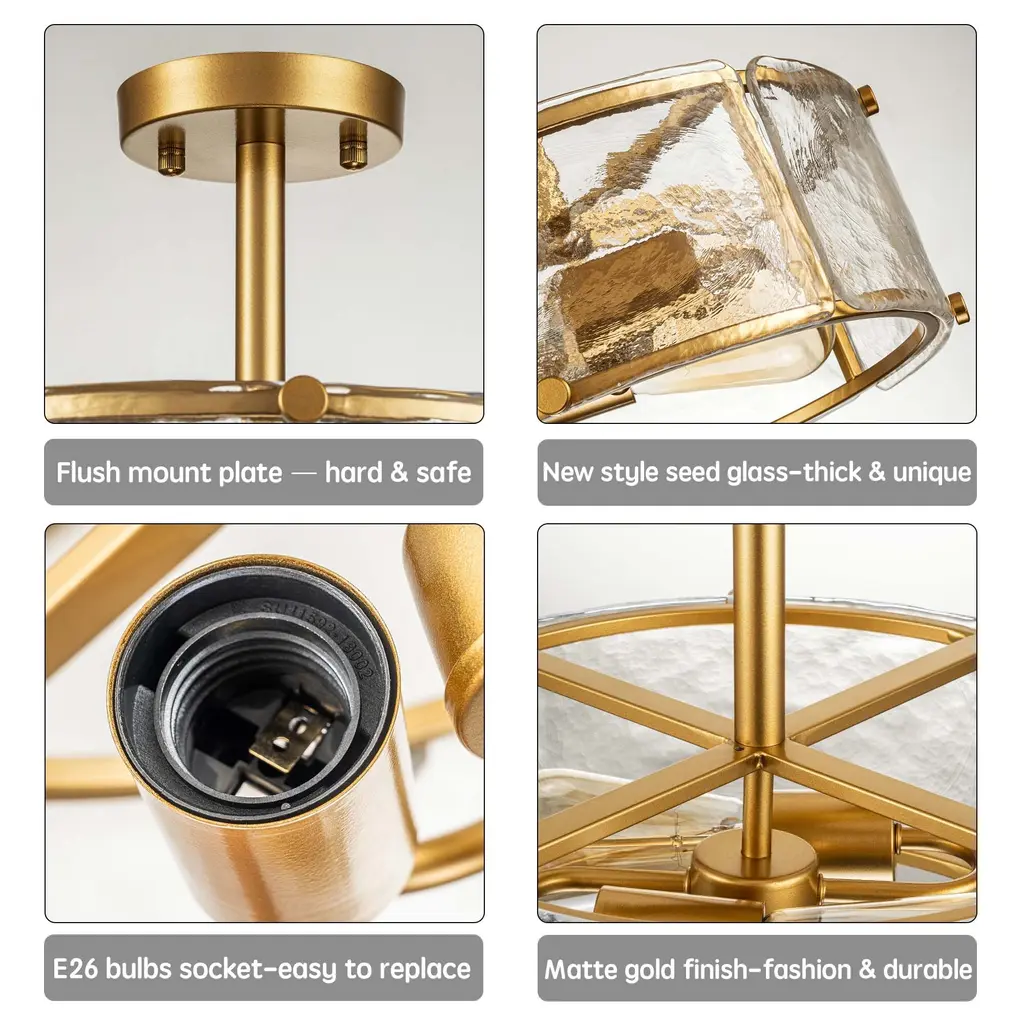 Add a touch of industrial charm to your space with the Starsky Semi-Flush Mount. Featuring a caged drum design with textured glass shades, this fixture combines modern aesthetics with farmhouse-inspired elements. The high-quality textured glass panels create an intriguing visual effect, casting unique patterns of light and shadow. Whether in a farmhouse kitchen or a contemporary living room, this fixture adds a stylish accent to your decor.Features:Product Details:Dimensions:Cleaning Note: