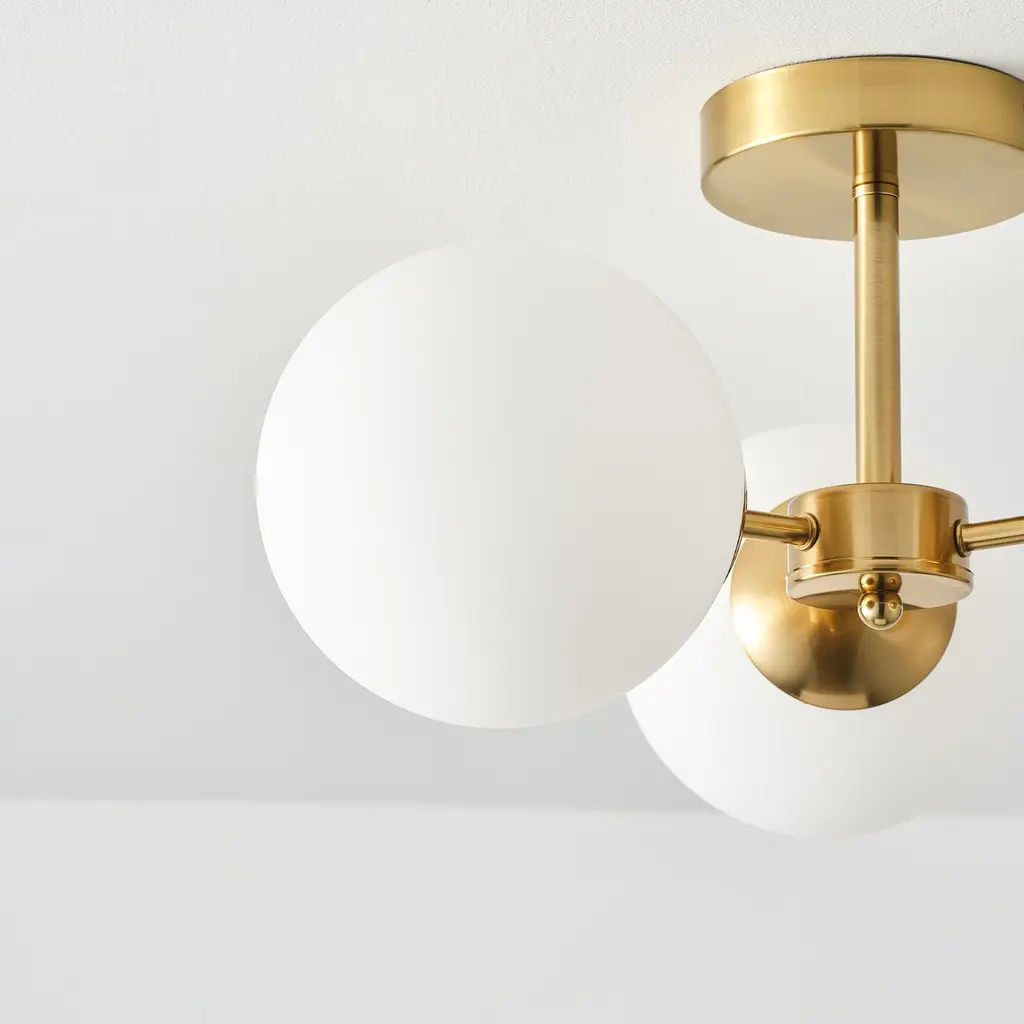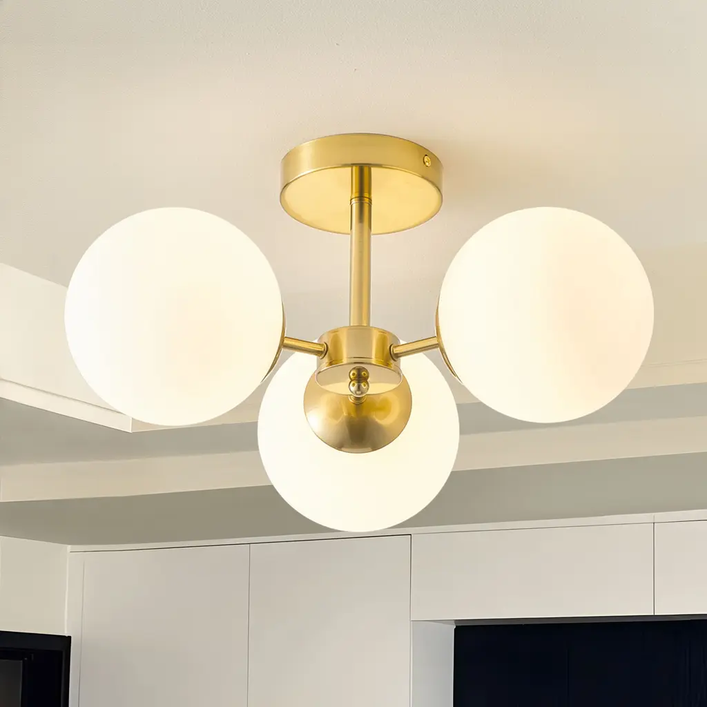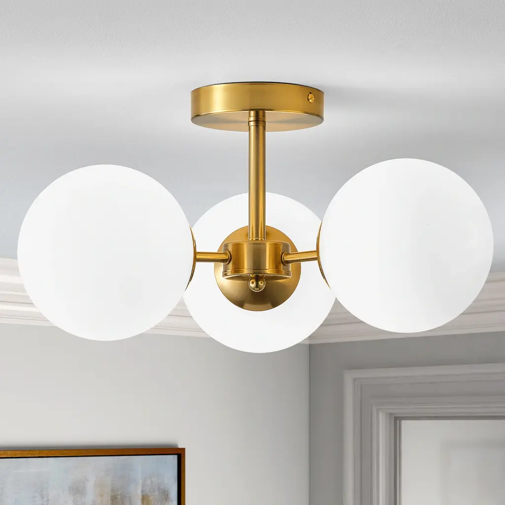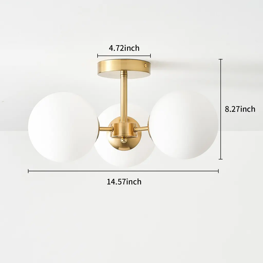 Elevate your space with the contemporary charm of the Starsky Semi-Flush Mount. Featuring a striking fusion of modern design and celestial inspiration, this fixture boasts a gold finish reminiscent of a Sputnik, complemented by frosted and twisted bubble glass globe bubbles. The Frosted Bubble option diffuses soft, inviting light, creating a cozy atmosphere, while the Twisted Bubble option casts captivating patterns with its textured glass, adding an elegant touch to any modern or traditional interior. With its Sputnik-inspired silhouette, this semi flush mount serves as a captivating focal point in any room.Features:Product Details:Dimensions:Cleaning Note: