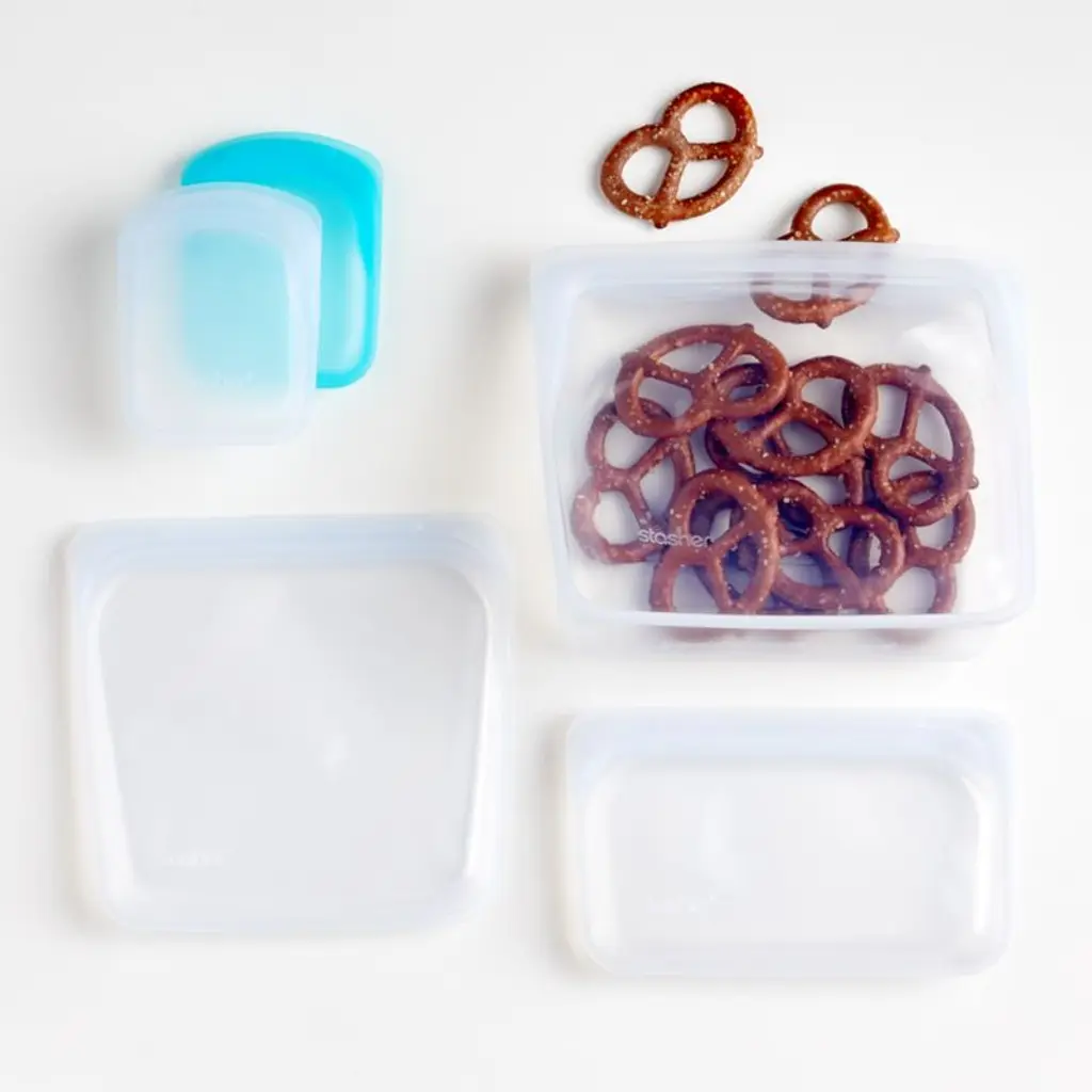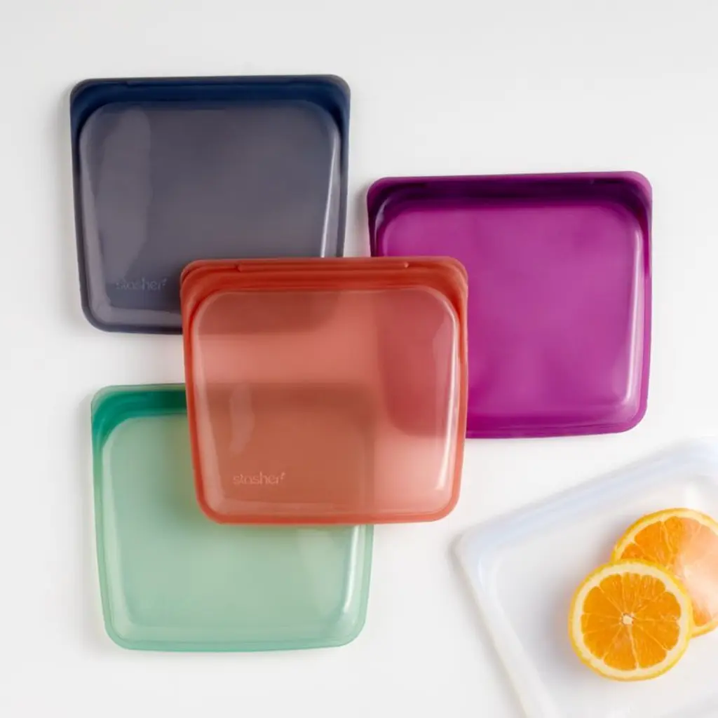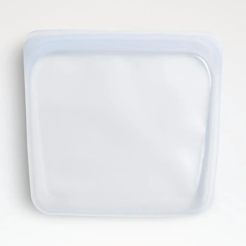 Stash everything from chopped vegetables to cosmetics to your phone in this resealable sack. Free of petroleum, the clear platinum silicone bag seals tightly, works in a sous vide, can be written upon and is touch-screen compatible. This sandwich size corrals chargers, freezes just-picked berries and totes sandwiches to the park. Stasher reusable silicone bags clean up easily in the dishwasher time after time and are safe to use in the freezer, microwave and oven.