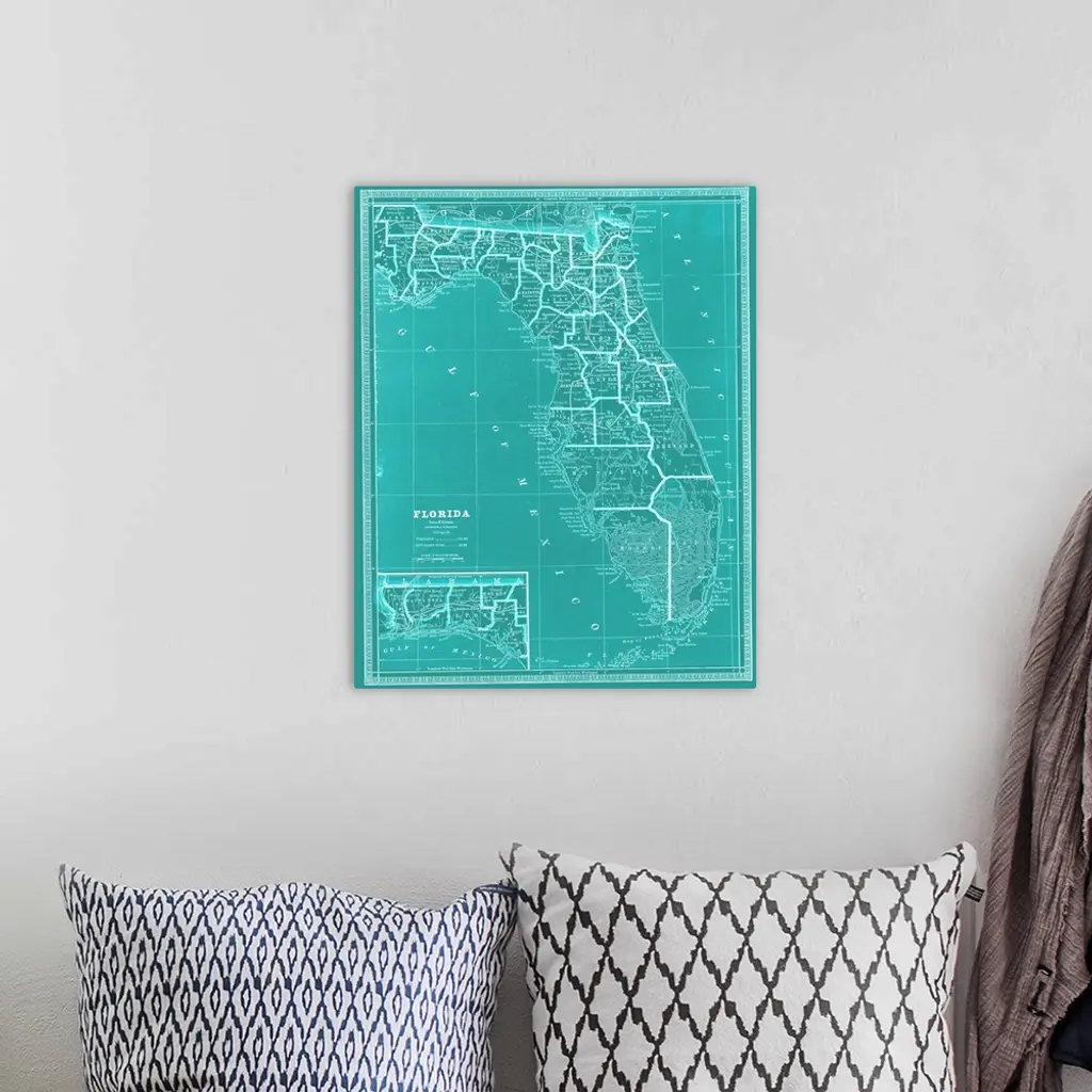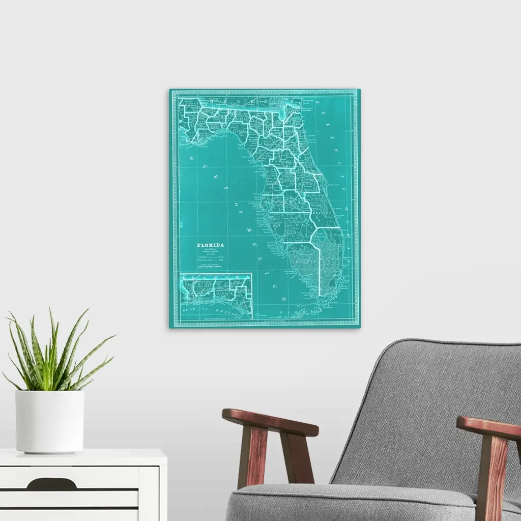 Teal and white map of the whole state of Florida. Original map chart is c.1903.