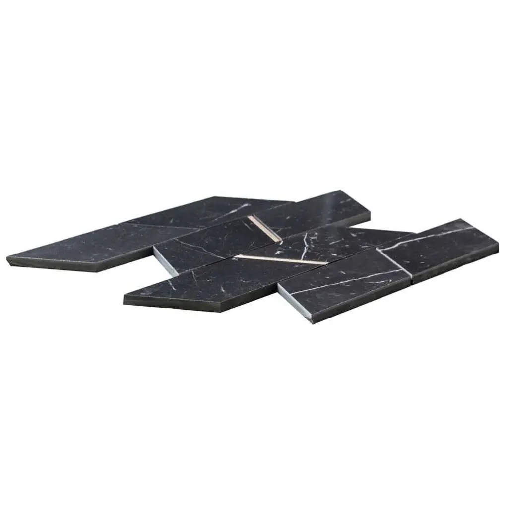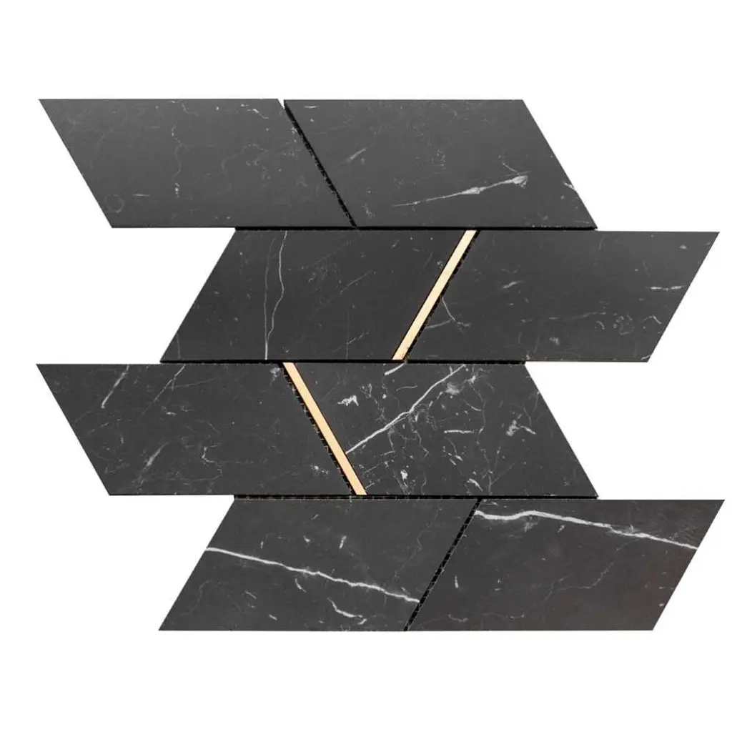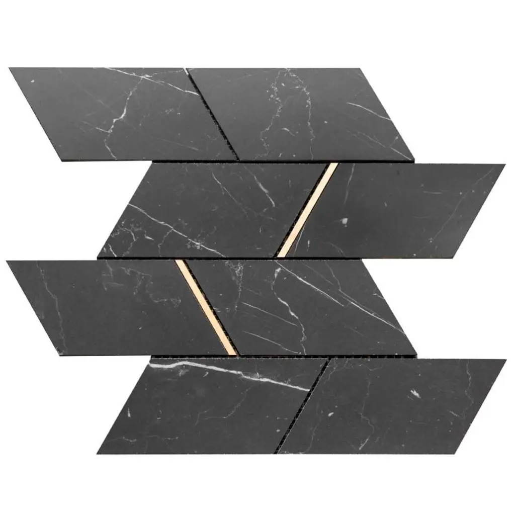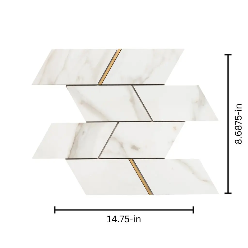 The Tile Life's Stately Avenue 11 inches x 12 inches Marble Look Porcelain Mosaic embodies opulence and classic beauty. These captivating geometric tiles are laced with contrasting-colored veins and bright gold decorative lines to create an elegant modern feel. Our Stately Avenue line is utilized best as a statement piece in your kitchen, bathroom, foyer, fireplace, or shower wall. A truly indulgent line, this collection provides the elegance that high-end homeowners are looking for. A beautiful polish finish makes the tile a highly reflective glossy look and provokes interest to those who see it. Approved for both residential and commercial indoor use, they're easy to install and built to last. Available in two striking colors: Nero Marquina and Calacatta Gold. FEATURES:DIMENSIONS: