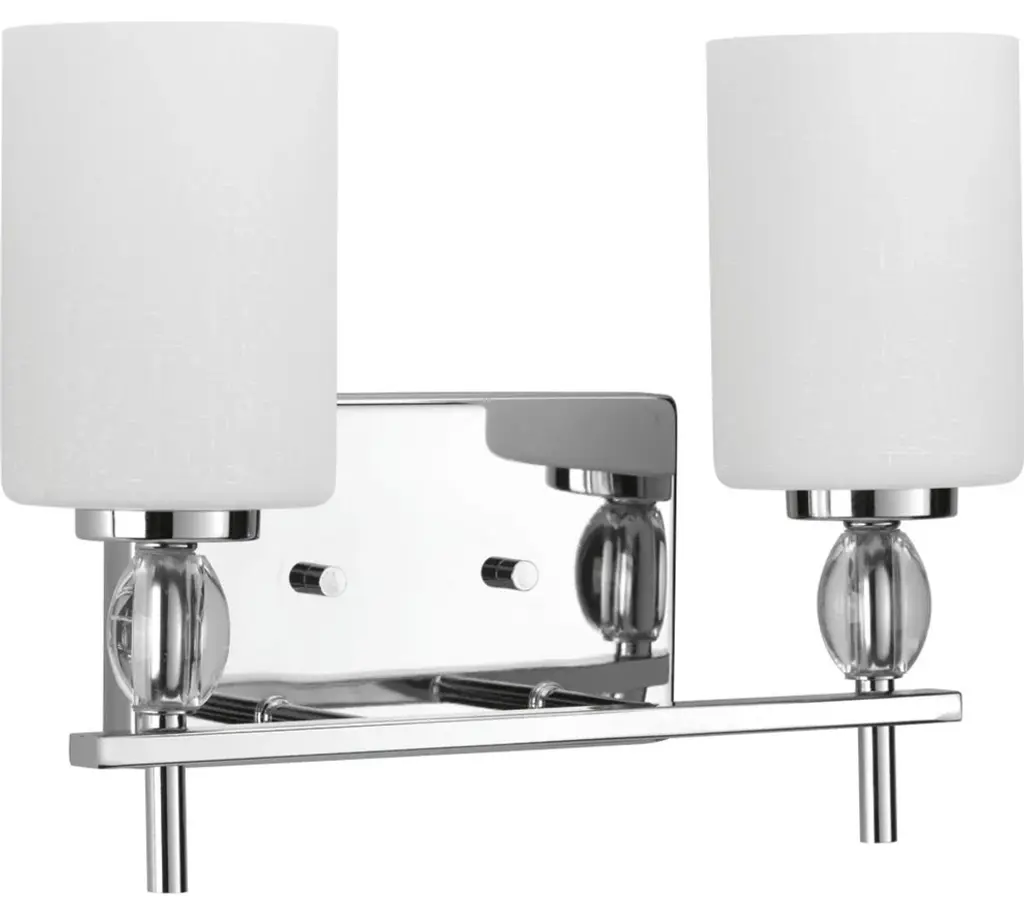 Enjoy high status with a collection full of fun, femininity, glimmer and gleam. K-9 glass accents offer crystal-like clarity to contrast the softened linen-finish glass shades. A Polished Chrome frame provides the perfect support to this elegant combination. Uses Two 100 W Medium Base bulbs (not included).