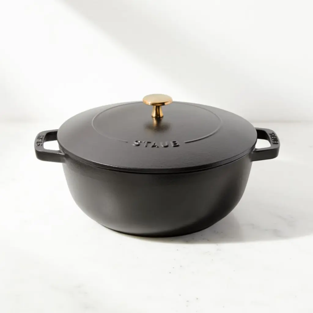 Preferred by some of world's greatest chefs, French-made Staub cookware is renowned for its superior heat retention and oven-to-table good looks. Made of enameled cast iron, this covered braising pan cooks evenly and efficiently and has a chic matte black enamel coating that resists chipping. Its signature matte-black enamel interior excels at braising, roasting and caramelizing, and is scratch resistant and easy to clean.