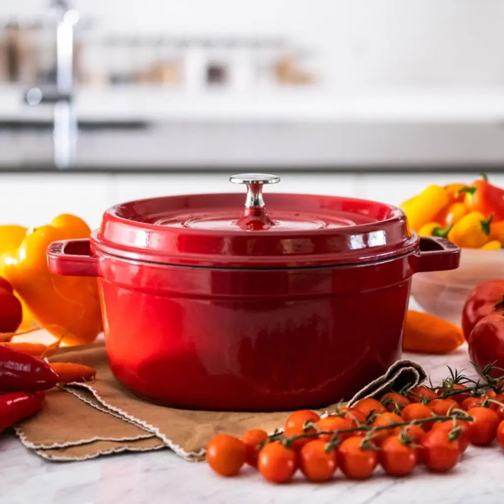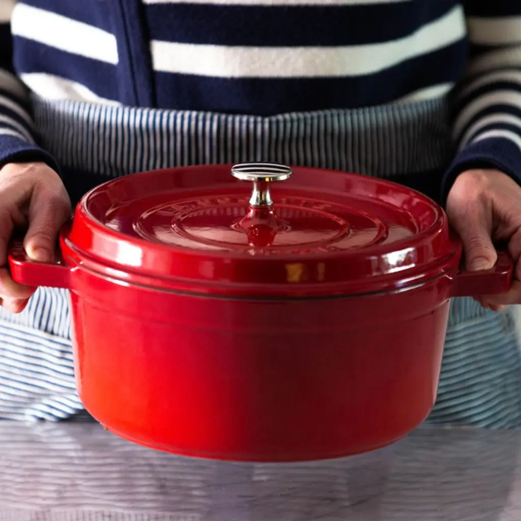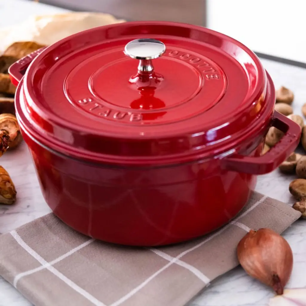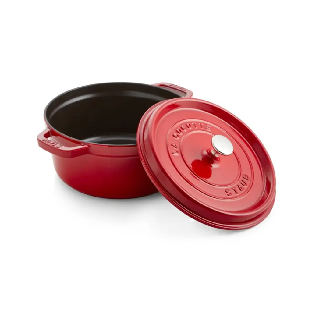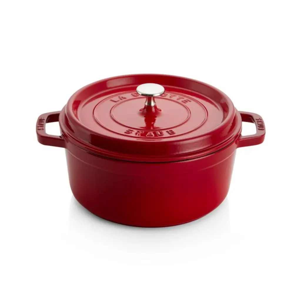 Preferred by some of the world's greatest chefs, French-made Staub cookware is renowned for its superior heat retention and oven-to-table good looks. Made of enameled cast iron, each piece cooks evenly and efficiently and has an attractive enamel coating that resists chipping. Its signature matte-black enamel interior excels at braising, roasting and caramelizing, and is scratch resistant and easy to clean. The round cocotte, in cherry red, is ideal for cooking fish, braising and browning meats and preparing soups and stews. To ensure moist and flavorful results, the spiked lid is designed to create a rain-forest effect that returns juices back on the food, providing continuous, natural basting.