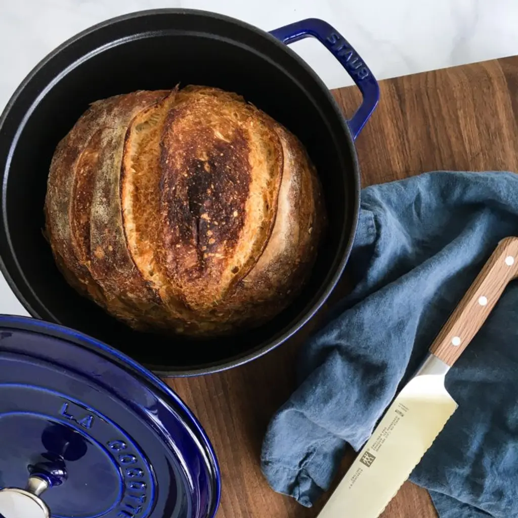 Preferred by some of the world's greatest chefs, French-made Staub cookware is renowned for its superior heat retention and oven-to-table good looks. Made of enameled cast iron, each piece cooks evenly and efficiently and has an attractive enamel coating that resists chipping. Its signature matte-black enamel interior excels at braising, roasting and caramelizing, and is scratch resistant and easy to clean. The round cocotte, in dark blue, is ideal for cooking fish, braising and browning meats and preparing soups and stews. To ensure moist and flavorful results, the spiked lid is designed to create a rain-forest effect that returns juices back on the food, providing continuous, natural basting.