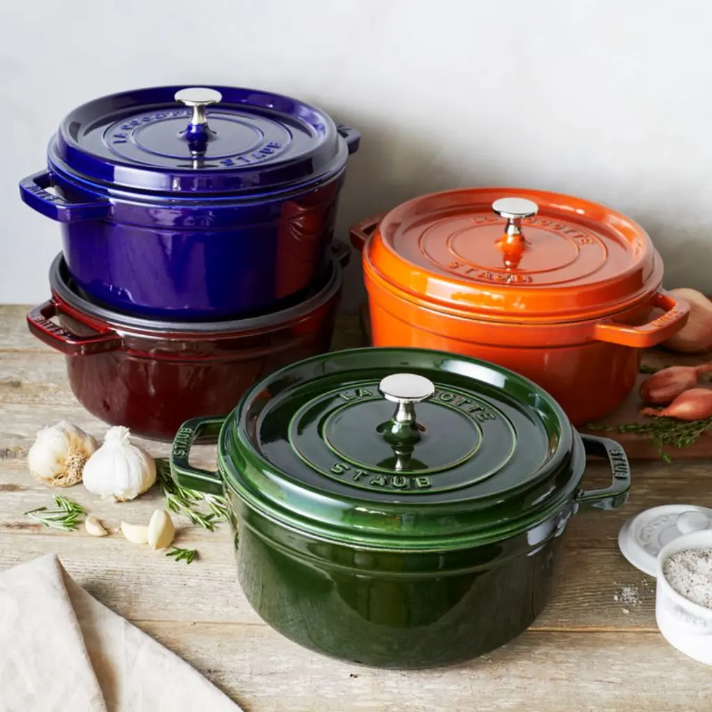 Preferred by some of the world's greatest chefs, French-made Staub cookware is renowned for its superior heat retention and oven-to-table good looks. Made of enameled cast iron, each piece cooks evenly and efficiently and has an attractive enamel coating that resists chipping. Its signature matte-black enamel interior excels at braising, roasting and caramelizing, and is scratch resistant and easy to clean. The round cocotte, in dark blue, is ideal for cooking fish, braising and browning meats and preparing soups and stews. To ensure moist and flavorful results, the spiked lid is designed to create a rain-forest effect that returns juices back on the food, providing continuous, natural basting.