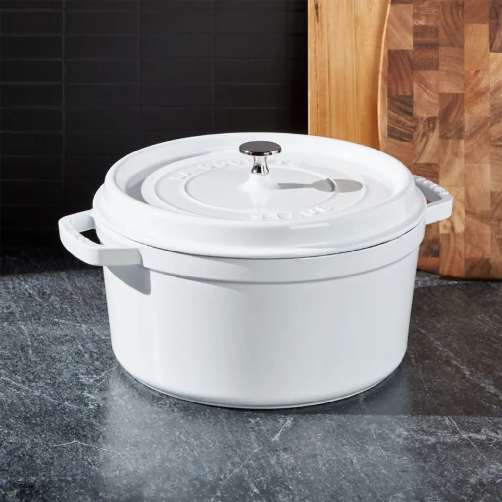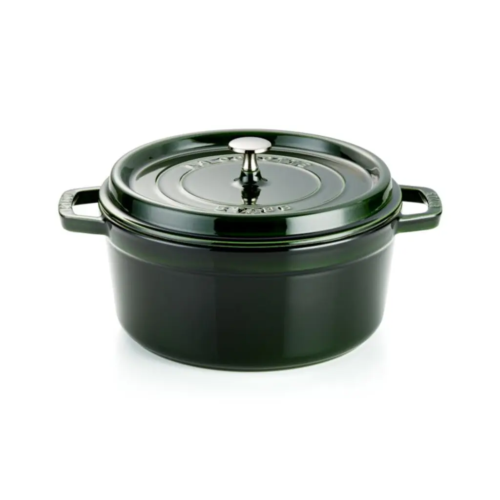Preferred by some of the world's greatest chefs, French-made Staub cookware is renowned for its superior heat retention and oven-to-table good looks. Made of enameled cast iron, this round covered pot cooks evenly and efficiently and has an attractive enamel coating in basil green that resists chipping. Its signature matte-black enamel interior excels at braising, roasting and caramelizing, and is scratch resistant and easy to clean. The round cocotte is ideal for cooking fish, braising and browning meats and preparing soups and stews. To ensure moist and flavorful results, the spiked lid is designed to create a rain-forest effect that returns juices back on the food, providing continuous, natural basting.