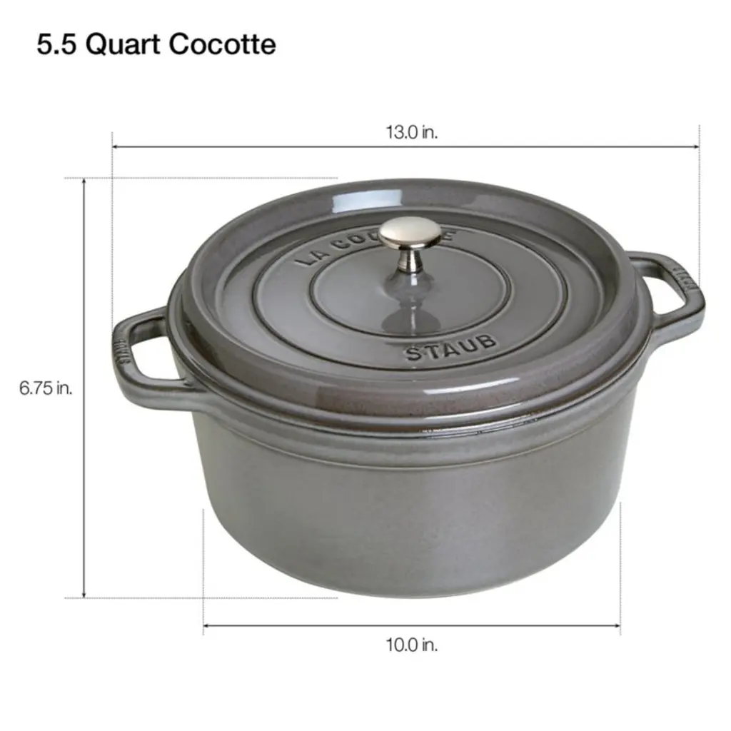 Preferred by some of the world's greatest chefs, French-made Staub cookware is renowned for its superior heat retention and oven-to-table good looks. Made of enameled cast iron, this round covered pot cooks evenly and efficiently and has an attractive enamel coating in basil green that resists chipping. Its signature matte-black enamel interior excels at braising, roasting and caramelizing, and is scratch resistant and easy to clean. The round cocotte is ideal for cooking fish, braising and browning meats and preparing soups and stews. To ensure moist and flavorful results, the spiked lid is designed to create a rain-forest effect that returns juices back on the food, providing continuous, natural basting.