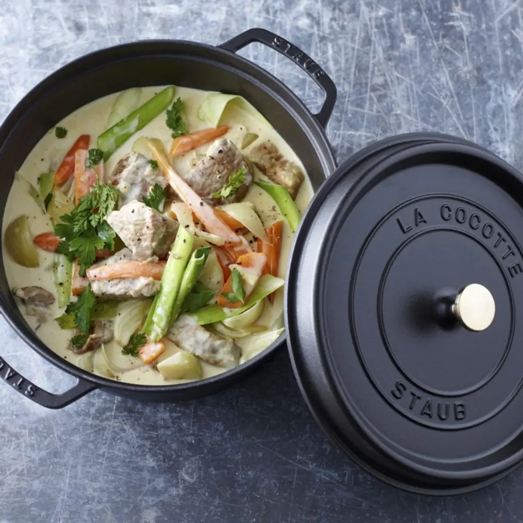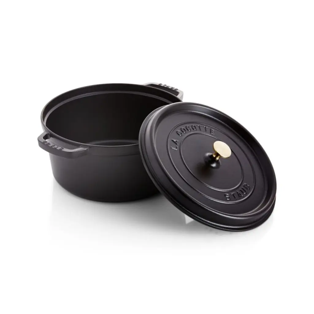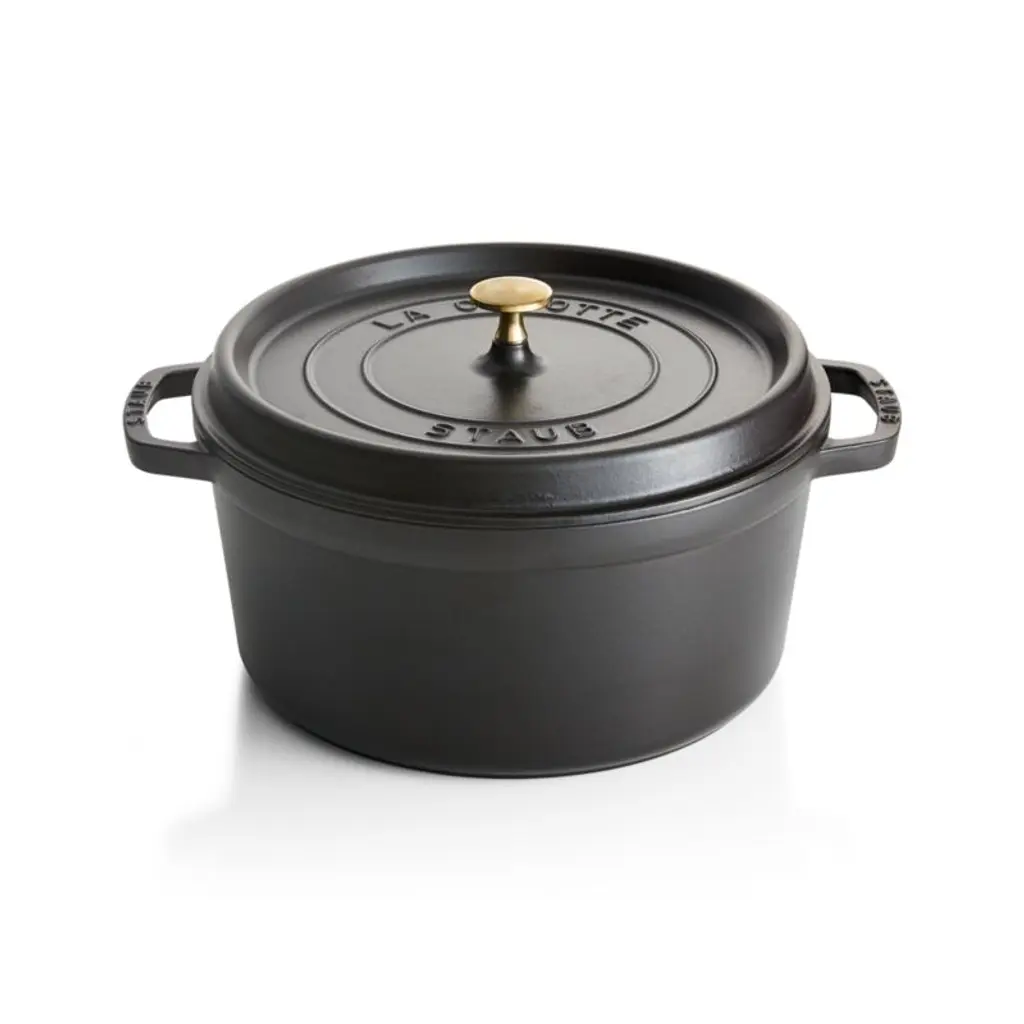 Preferred by some of the world's greatest chefs, French-made Staub cookware is renowned for its superior heat retention and oven-to-table good looks. Made of enameled cast iron, each piece cooks evenly and efficiently and has an attractive enamel coating that resists chipping. Its signature matte-black enamel interior excels at braising, roasting and caramelizing, and is scratch resistant and easy to clean. The round cocotte, in matte black, is ideal for cooking fish, braising and browning meats and preparing soups and stews. To ensure moist and flavorful results, the spiked lid is designed to create a rain-forest effect that returns juices back on the food, providing continuous, natural basting.