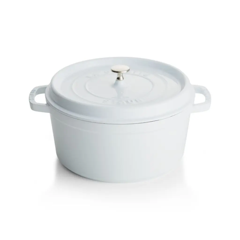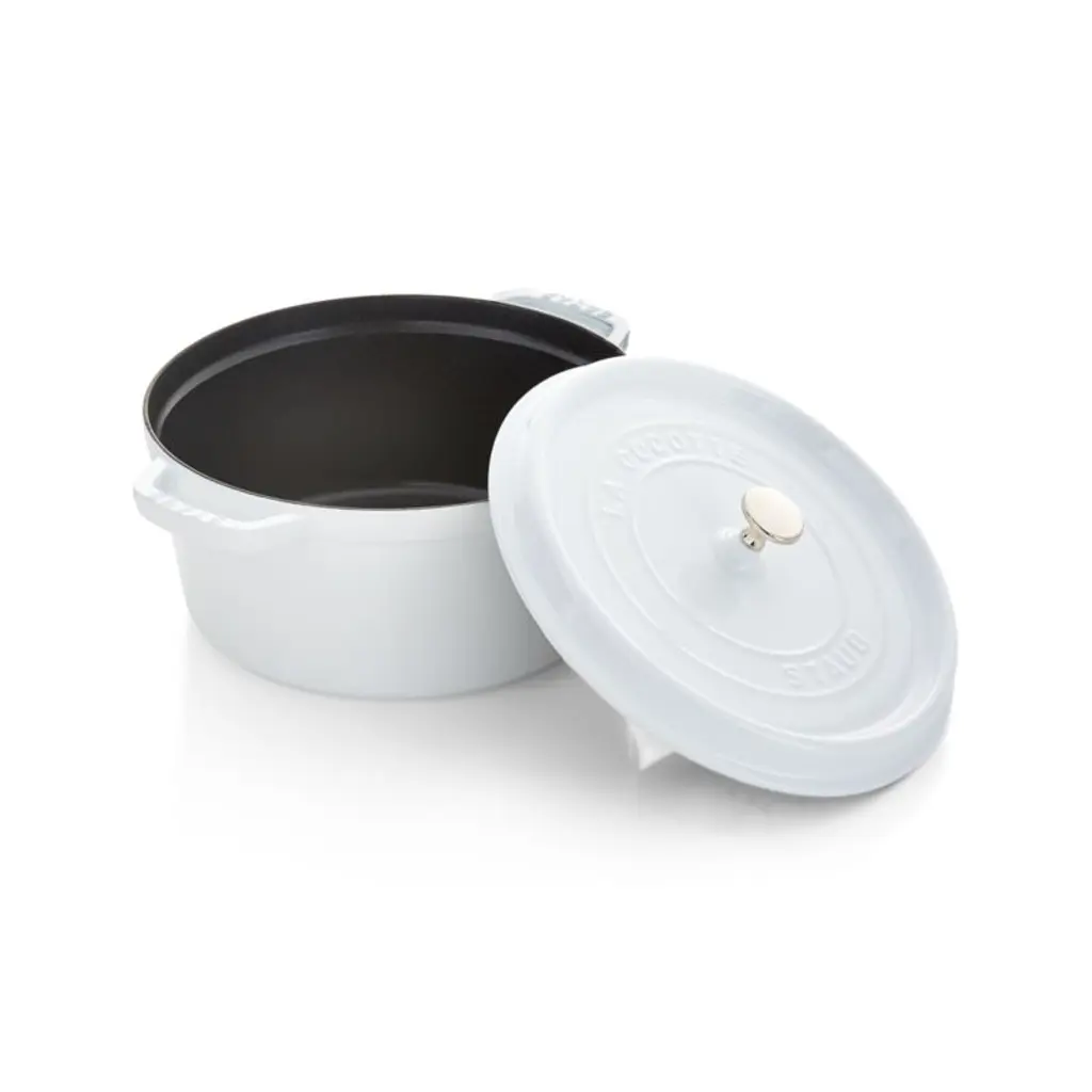 Preferred by some of the world's greatest chefs, French-made Staub cookware is renowned for its superior heat retention and oven-to-table good looks. Made of enameled cast iron, each piece cooks evenly and efficiently and has an attractive enamel coating that resists chipping. Its signature matte-black enamel interior excels at braising, roasting and caramelizing, and is scratch resistant and easy to clean. The round cocotte, in white, is ideal for cooking fish, braising and browning meats and preparing soups and stews. To ensure moist and flavorful results, the spiked lid is designed to create a rain-forest effect that returns juices back on the food, providing continuous, natural basting.