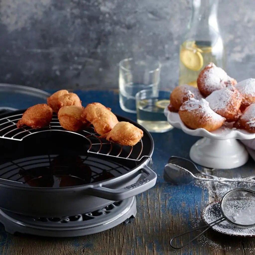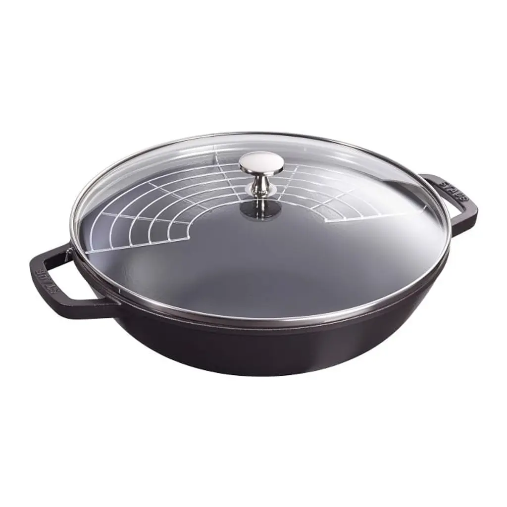 Both versatile and durable, Staub cast iron and ceramic cookware brings high-quality French craftsmanship to every kitchen with their innovative design and timeless appeal. Aptly named, the Perfect Pan does everything from searing and sautéing to steaming and stir frying with a glass lid to retain moisture. Wide angled sides will bring spillage to a minimum when deep-frying. 13.4"w x 17.7"d x 4.7"h. 4.5 Qt. capacity. Lead-, PTFE-, and PFOA-free cast iron body. Matte black enameled bottom. Glass lid included with steel knob in a Nickel finish. Oven safe up to 500°F. Freezer safe. Suitable for all stovetops, including gas, electric and induction. Sold individually. Made in France.