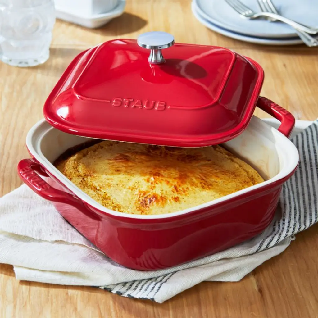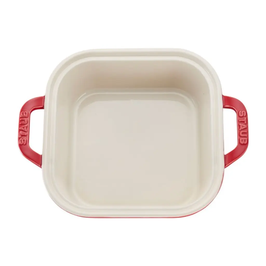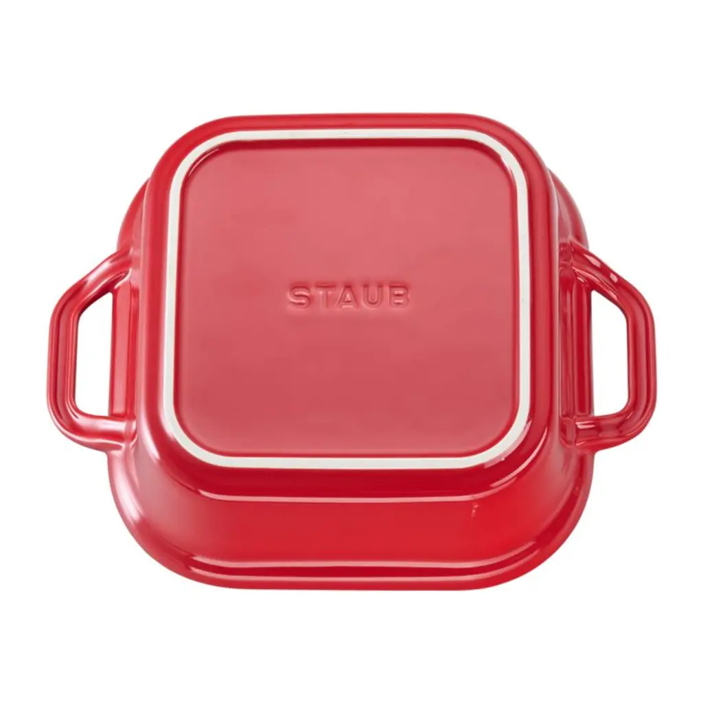Rooted in French culinary heritage, Staub cookware is beloved by professional and home chefs for its exquisite craftsmanship, exceptional performance and timeless beauty. This square ceramic baking dish puts a pop of color in your kitchen, finished with a cherry red porcelain enamel glaze that prevents absorption of moisture during baking. Extremely resistant to impact and thermal shock, the versatile lidded casserole dish easily goes from freezer to oven to table.