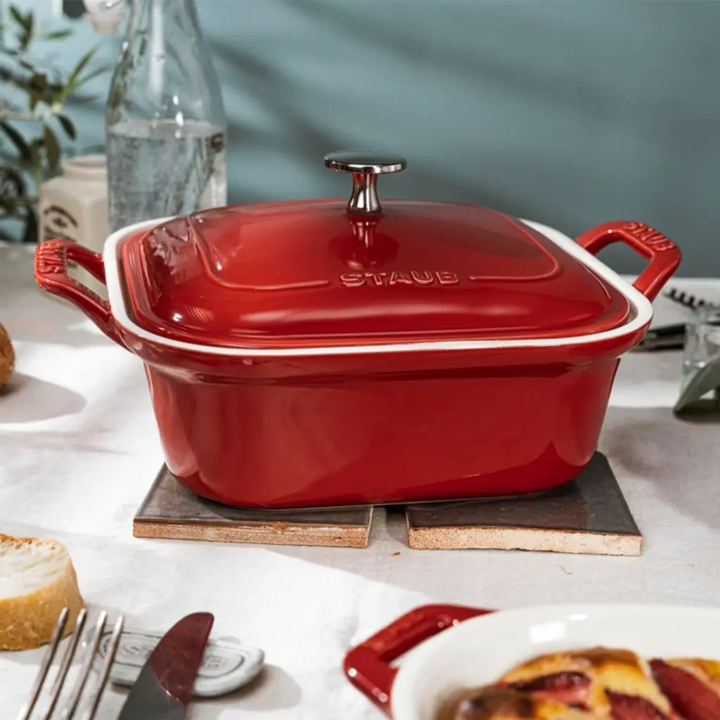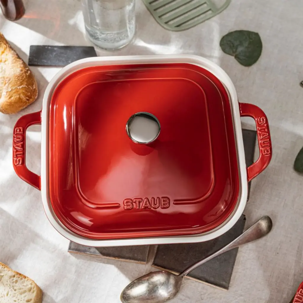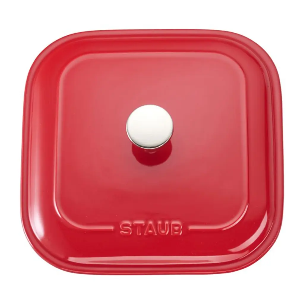 Rooted in French culinary heritage, Staub cookware is beloved by professional and home chefs for its exquisite craftsmanship, exceptional performance and timeless beauty. This square ceramic baking dish puts a pop of color in your kitchen, finished with a cherry red porcelain enamel glaze that prevents absorption of moisture during baking. Extremely resistant to impact and thermal shock, the versatile lidded casserole dish easily goes from freezer to oven to table.