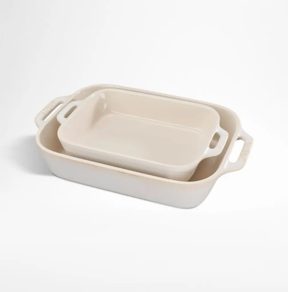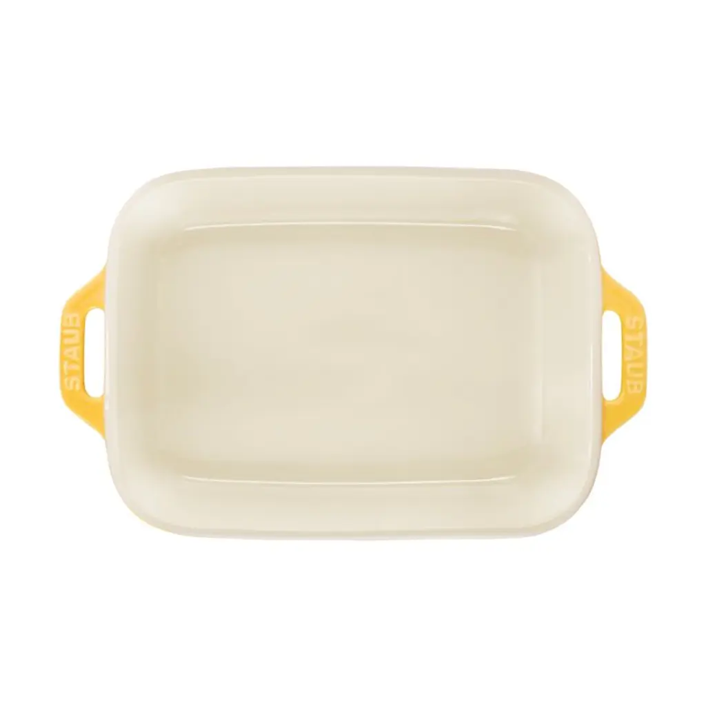 The two baking dishes in this set sport lemony yellow exteriors to brighten up everyday baking and tableside serving. Glazed with porcelain enamel, the stoneware baking dishes prevent moisture absorption for superior results and can be used in the microwave, oven and broiler. Resistant to scratching and equipped with loop handles, the citron yellow ceramic bakers in the two-piece set nest for easy storage.Rooted in French culinary heritage, Staub cookware is beloved by professional and home chefs for its exquisite craftsmanship, exceptional performance and timeless beauty.