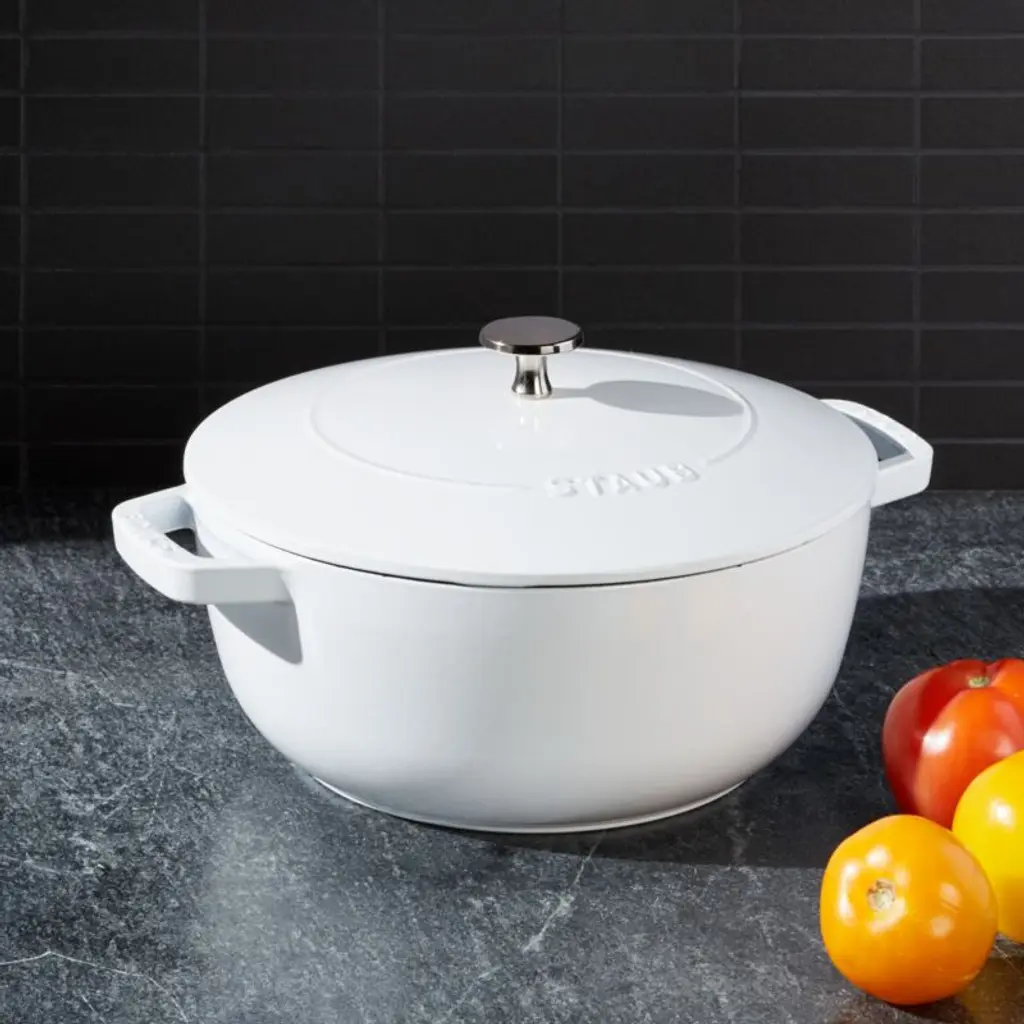 Preferred by some of the world's greatest chefs, French-made Staub cookware is renowned for its superior heat retention and oven-to-table good looks. Made of enameled cast iron, each piece cooks evenly and efficiently and has an attractive enamel coating that resists chipping. Its signature matte-black enamel interior excels at braising, roasting and caramelizing, and is scratch resistant and easy to clean. Enameled in cherry red, the Dutch oven is a timeless standby for stews, roasts, casseroles and other one-pot classics. To ensure moist and flavorful results, the spiked lid is designed to create a rain-forest effect that returns juices back on the food, providing continuous, natural basting.
