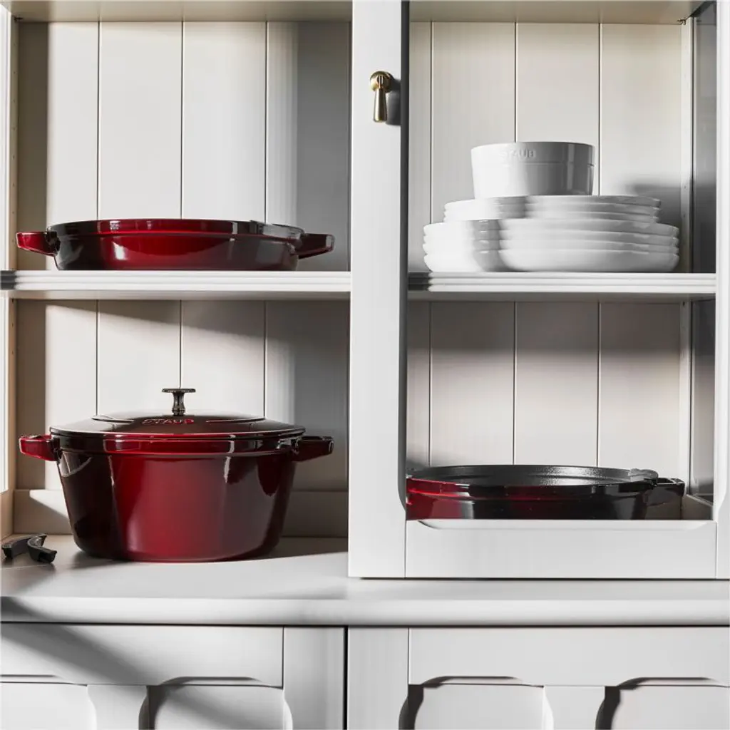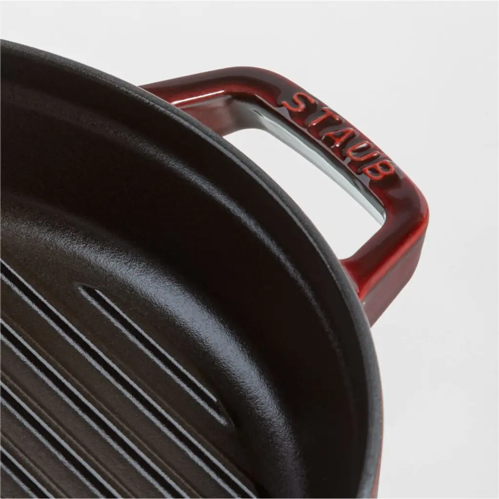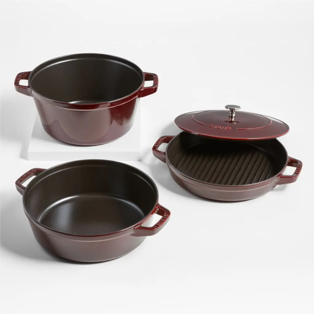 Preferred by some of the world's greatest chefs, Staub cookware is renowned for its superior heat retention and oven-to-table good looks. Each component of this four-piece cast iron set cooks evenly and efficiently and has a glossy dark red enamel coating that resists chipping. The signature matte black interiors excel at braising, roasting and caramelizing, and are scratch-resistant and easy to clean. The cocotte and braiser are ideal for cooking fish, braising and browning meats and preparing soups and stews. Ridges on the bottom of the round grill pan sear grill marks into food, while the rough texture provides exceptional browning. To ensure moist and flavorful results, the spiked lid fits all three pans to create a rain-forest effect that returns juices back on the food, providing continuous, natural basting. The four components stack for compact storage without scratching.Staub's signature cast iron cookware has been crafted in France for over 40 years.