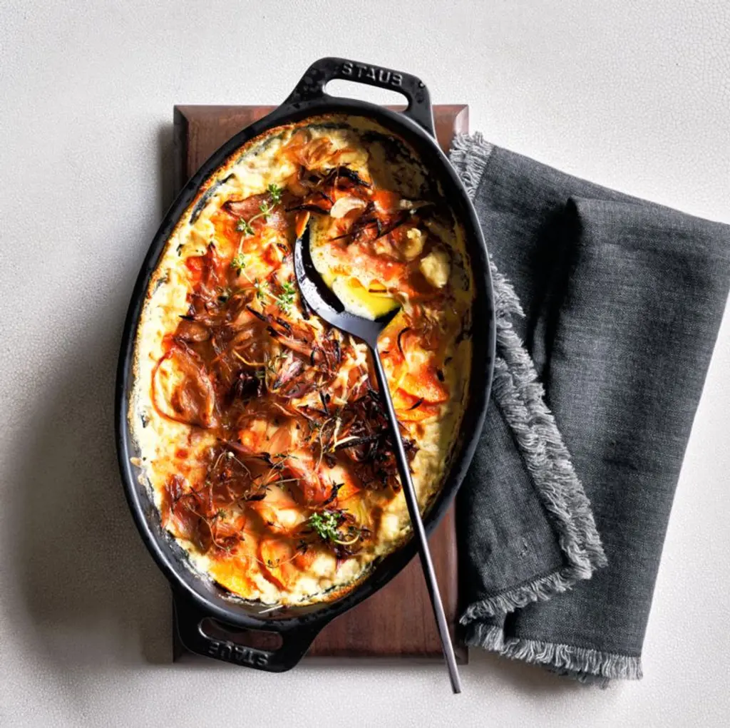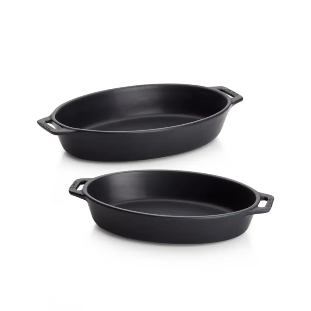 These oval ceramic baking dishes in two convenient sizes look amazing in your kitchen, glazed matte black with a porcelain enamel finish that prevent absorption of moisture during baking. Enjoy gooey mac n' cheese, buttery apple crisp, and moist brownies every time. Extremely resistant to impact and thermal shock, the dishes go straight from freezer to oven to table. Rooted in French culinary heritage, Staub cookware is beloved by professional and home chefs for its exquisite craftsmanship, exceptional performance and timeless beauty.