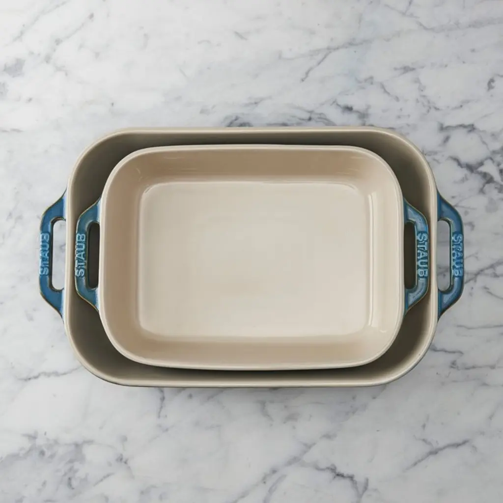 These ceramic baking dishes in two convenient sizes look amazing in your kitchen, glazed turquoise and creamy white with a porcelain enamel finish that prevent absorption of moisture during baking. Enjoy gooey mac n' cheese, buttery apple crisp, and moist brownies every time. Extremely resistant to impact and thermal shock, the dishes go straight from freezer to oven to table. Rooted in French culinary heritage, Staub cookware is beloved by professional and home chefs for its exquisite craftsmanship, exceptional performance and timeless beauty.