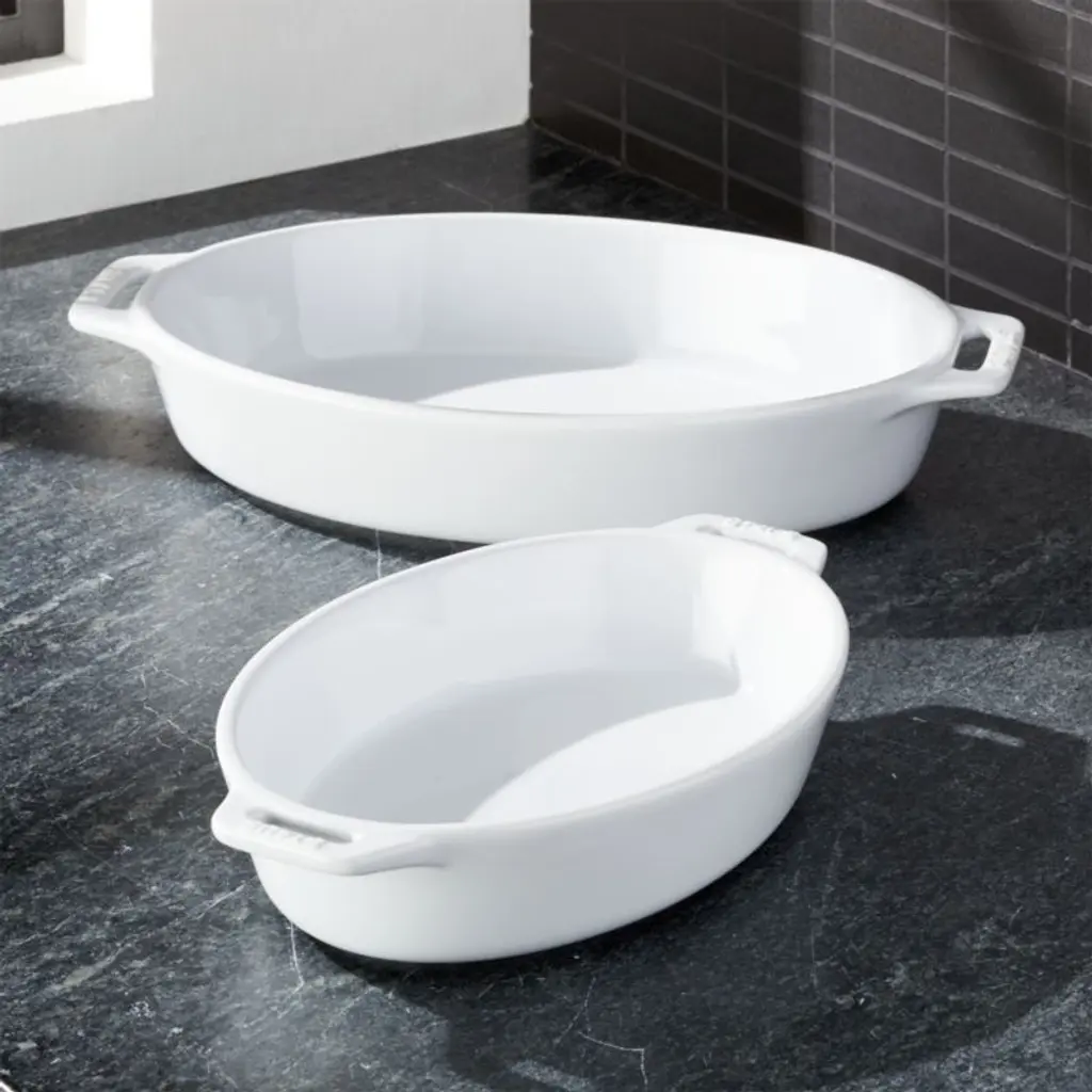 These ceramic baking dishes in two convenient sizes look amazing in your kitchen, glazed turquoise and creamy white with a porcelain enamel finish that prevent absorption of moisture during baking. Enjoy gooey mac n' cheese, buttery apple crisp, and moist brownies every time. Extremely resistant to impact and thermal shock, the dishes go straight from freezer to oven to table. Rooted in French culinary heritage, Staub cookware is beloved by professional and home chefs for its exquisite craftsmanship, exceptional performance and timeless beauty.