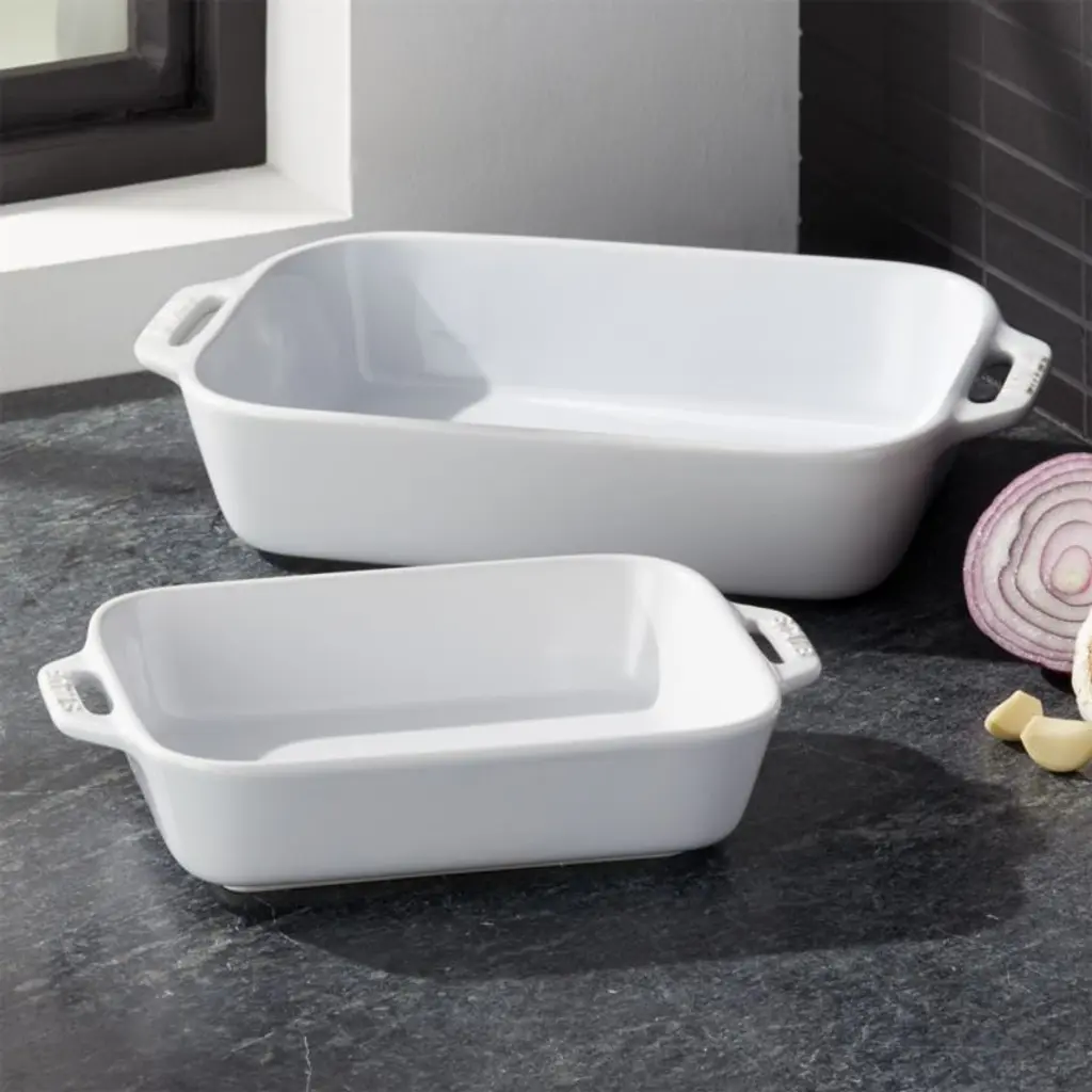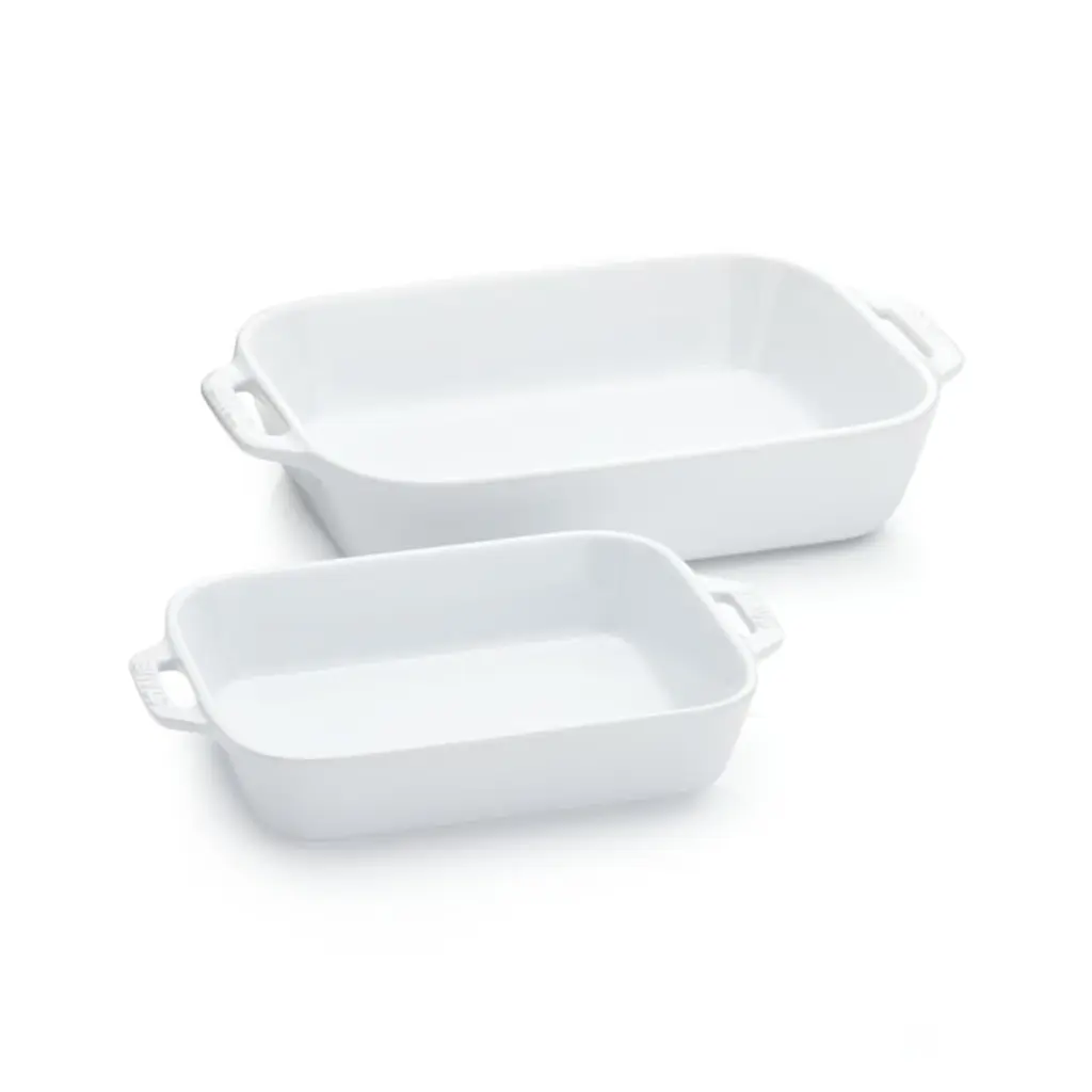 Staub bakes breakfast, dinner and dessert with a pair of stoneware baking dishes glazed white with a porcelain enamel finish that prevents absorption of moisture. Enjoy gooey mac n' cheese, buttery apple crisp, and moist brownies every time. Extremely resistant to impact and thermal shock, the dishes go straight from freezer to oven to table. Rooted in French culinary heritage, Staub cookware is beloved by professional and home chefs for its exquisite craftsmanship, exceptional performance and timeless beauty.