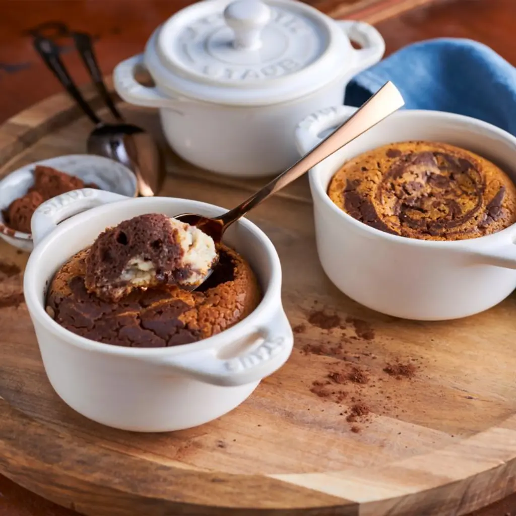 Rooted in French culinary heritage, Staub cookware is beloved by professional and home chefs for its exquisite craftsmanship, exceptional performance and timeless beauty. Finished with a white glass-porcelain enamel that prevents absorption of moisture during baking, the three mini cocottes present diners with charming single servings of mac and cheese, baked polenta and cheesecake. Resistant to scratches, stains, impact and thermal shock, these lidded baking dishes easily go from freezer to oven to table to dishwasher.