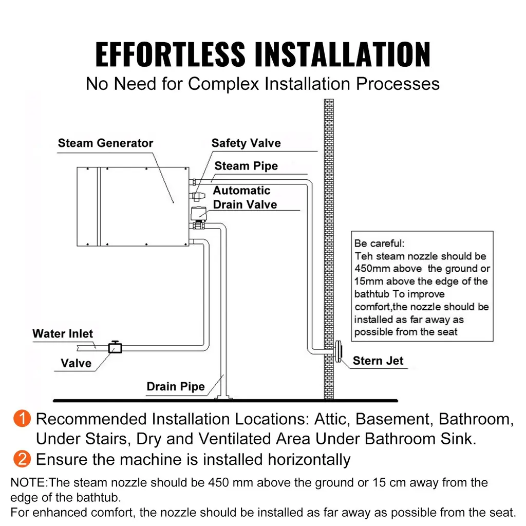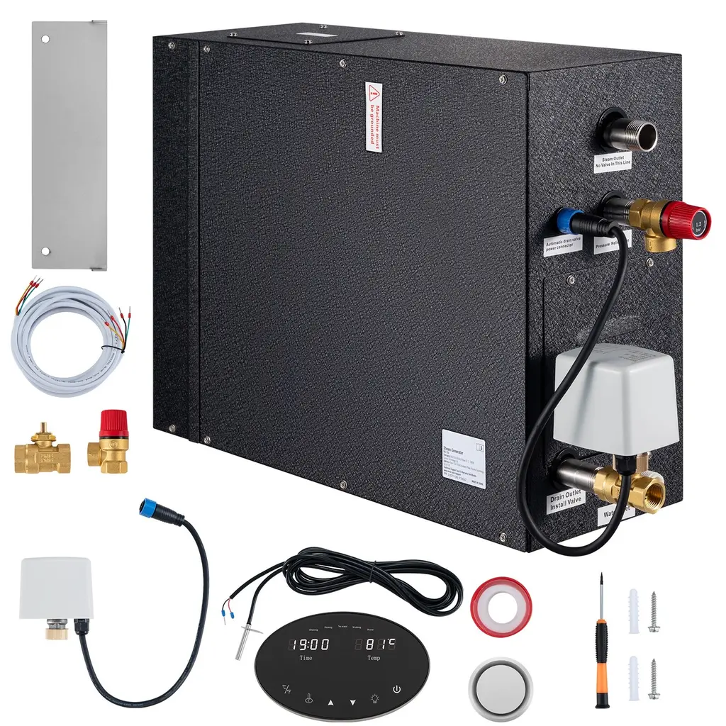 Multi-Functional Steam Generator : Our steam shower generator features include an automatic drainage system, temperature control from 77-131°F, 24-hour customizable operation, smart touch controls, overheating, water shortage, and overpressure protection, and more. All designed to offer you a worry-free private steam spa experience. Reliable and Durable: Our steam spa offers comfort and safety with built-in protections against overheating, water shortage, and overpressure. It features an automatic drainage system and a stainless steel tank with an integrated magnesium rod, ensuring clean steam output and energy efficiency while prolonging the machine's lifespan. Exceptional Performance: The steam bath generator features 316 heating elements, achieving higher and more reliable heat transfer efficiency; the automatic segmented heating technology provides invigorating steam within just five minutes. Premium Accessories: Equipped with comprehensive and sturdy accessories, saving you additional expenses while relieving installation worries. Easy Installation: Tailored for private residences, the mature and stable technology eliminates the need for complex installation. Simply follow the instructions to connect the water source and power, and it's easy to operate. Package Content 1 x Controller 1 x Connection Line 1 x Safety Valve 1 x Temperature Sensor 1 x Electric Valve 1 x Install Hanging Board 1 x Steam Nozzle 1 x Instructions
