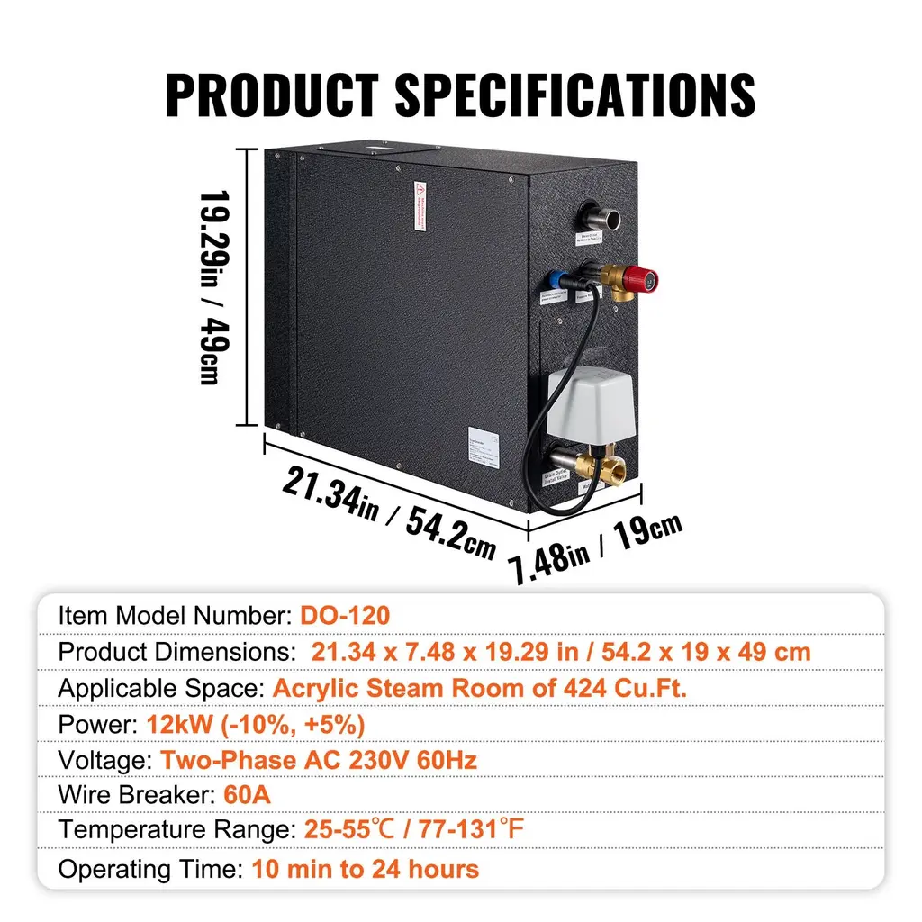 Steam Shower Generator, Segmented Heating & Temperature Customization & 24h Timer Steam Bath Kit, Automatic Drainage - 12kw