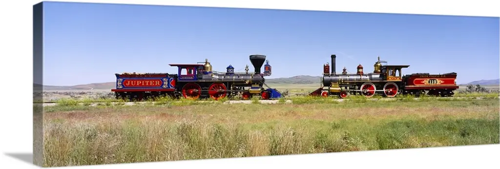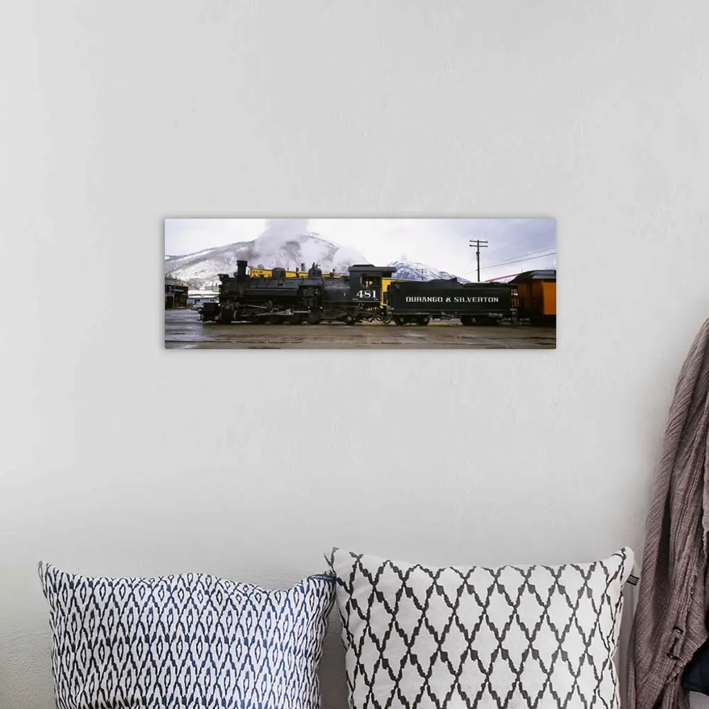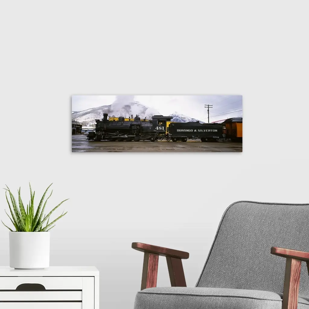 Oversized, horizontal photograph of a steam powered train and cars at the Durango and Silverton Narrow Gauge Railroad in Colorado, snow covered mountains in the background.