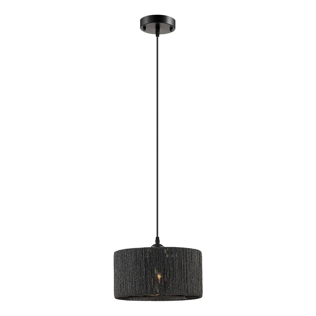 Add texture and contrast to your lighting scheme with the Steel and Ropes with Shade Pendant, a compact fixture that blends refined form with handmade appeal. The cylindrical shade is wrapped in tightly woven black twine, offering a tactile surface that diffuses light beautifully while making a sculptural statement. With 3000 lumens of dimmable LED brightness and an adjustable hanging length, this chandelier is ideal for dining spaces, reading corners, or minimalist interiors seeking depth and atmosphere.Specs:Material: Iron + Twine Finish: Black Iron Dimmable 3000 Lumens Wattage: 6W 1 LED E26 Bulb Included Dimensions: 11.81 x 11.81 x 5.9 inches Weight: 2.8 lbs Shipping Dimensions: 12.2 x 12.2 x 6.49 inches Shipping Weight: 3.7 lbs Canopy Dimensions: 4.72 x 4.72 x 0.98 inches Hanging Length Adjustable up to 12 ft Assembly Needed 3 Year Limited Manufacturer Warranty