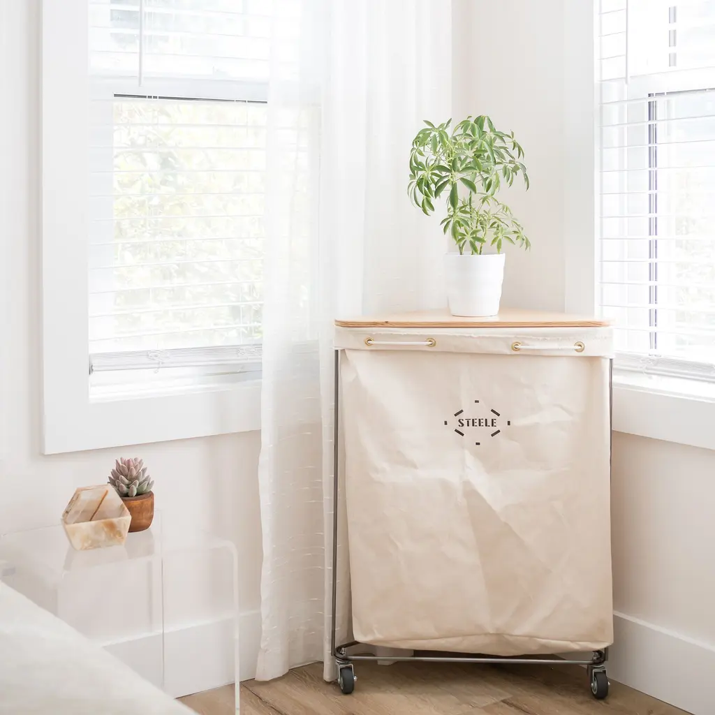 Family owned for multiple generations, Steele Canvas is a 100+ year old American manufacturer. Its small footprint holds plenty of clothes. Conveniently fits into the corner of any room. Add the wooden lid to hide your laundry and gain a surface.