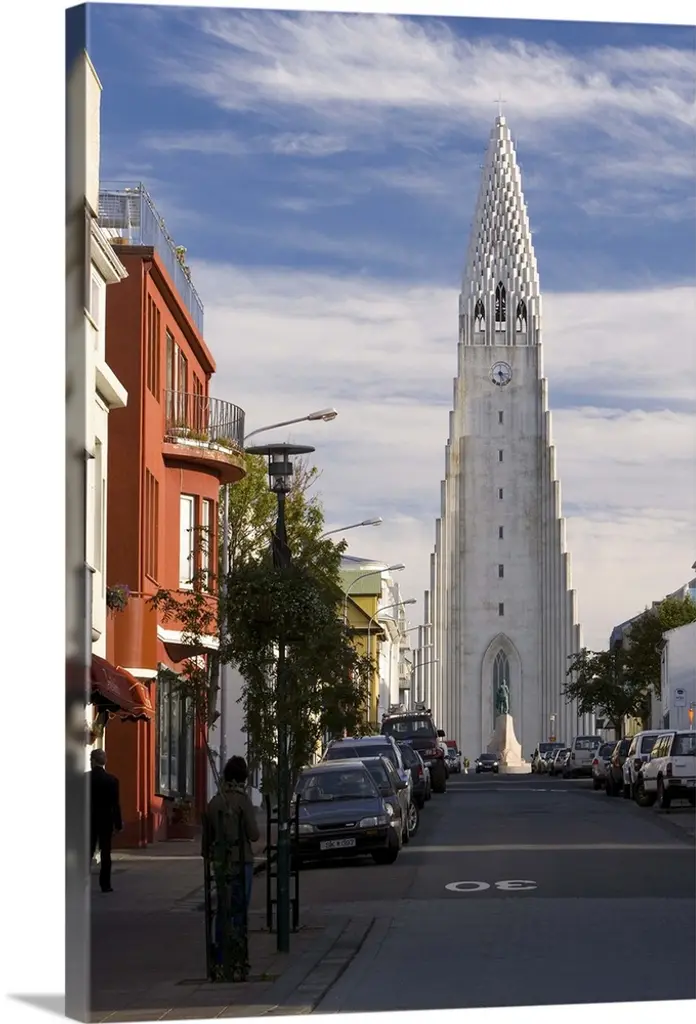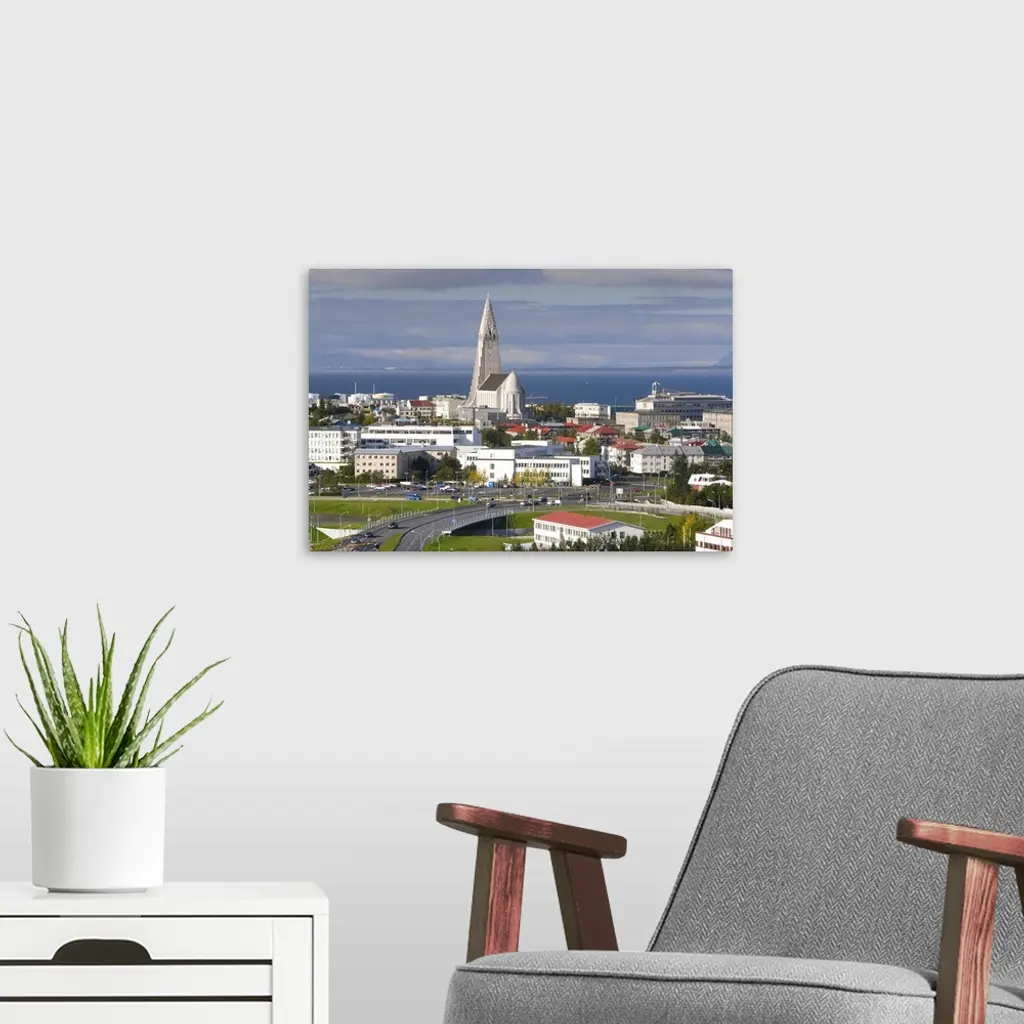 The 75m tall steeple and vast modernist church of Hallgrimskirkja, rising above the city, built between 1940 and 1974, Reykjavik, Iceland, Polar Regions