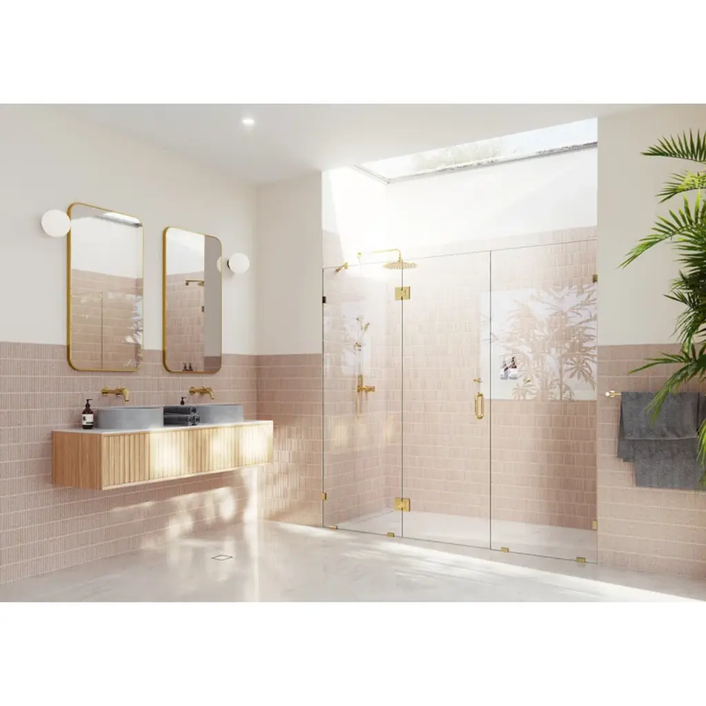 The Stellar is a beautiful, three-panel, glass-hinged shower enclosure that adds openness and an element of elegance and luxury to your bathroom. Taller than most competitor shower enclosures, each frameless 3/8" tempered glass panel comes in a standard 78" height. At the same time, the door is positioned in the center to allow easy access and space for wall accessories or a design that doesn't suit a wall-hung door. Glass is treated on both sides with EnduroShield coating, which aids in repelling water and soap residue, allowing the panels to be fully reversible. In addition, our superior quality solid hardware is available in a variety of color finishes to suit any bathroom. With our extensive range of frameless shower doors and panel sizes, the Stellar by Glass Warehouse is the perfect model to suit a dual shower or to span a wider shower enclosure.