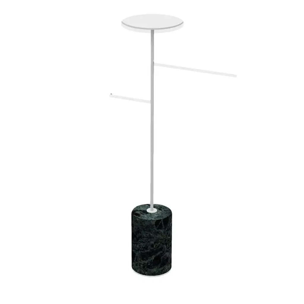 Defined by a captivatingly airy silhouette in black anthracite-lacquered iron, this coat hanger and rack will be an optimal solution for a contemporary entryway, living room, or bedroom decor. Resting on a round base and topped with a round tray, its slim, 1m-tall stem is equipped with two horizontal coat bars. Customizable in lacquer and available in a range of marbles for the base, please ask for options and pricing details.