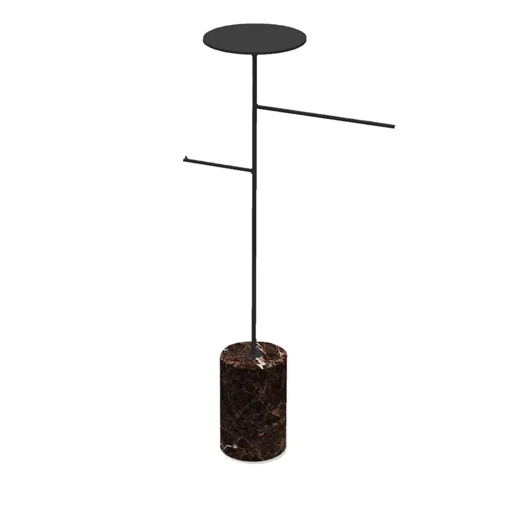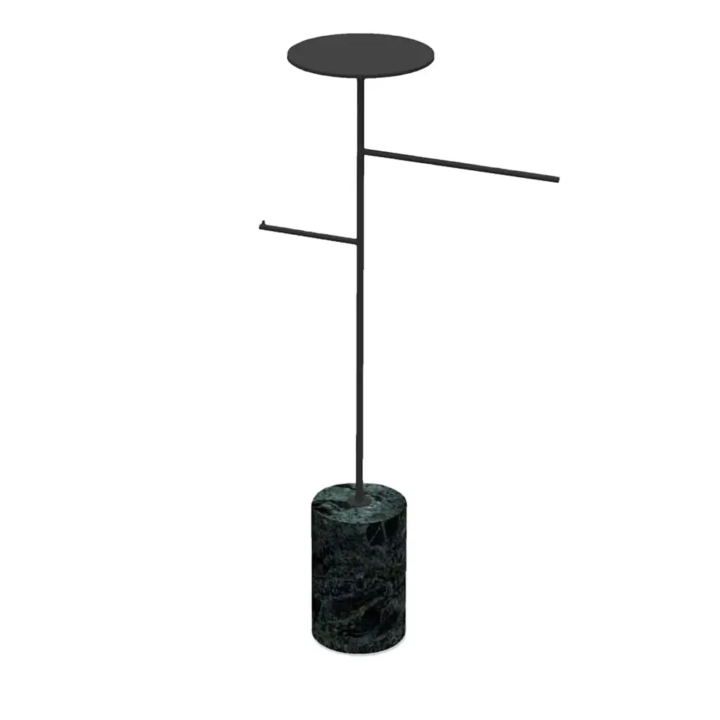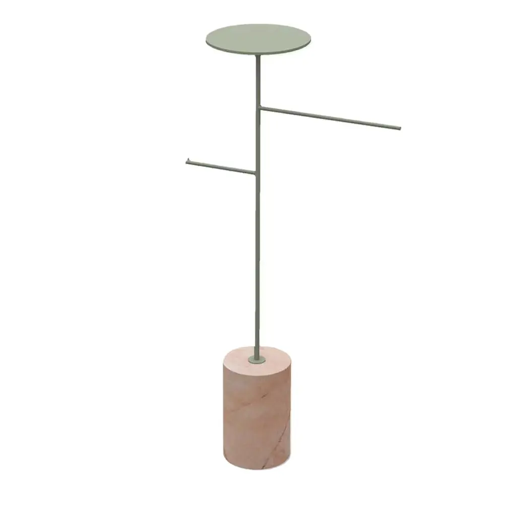 The exquisite blend of different materials, textures, and hues distinguishing this splendid coat hanger and rack which cleverly juxtaposes lines and geometric shapes for a bold design. Fashioned of sage green-lacquered iron, the stem with two arms and a round, top tray is firmly mounted on a Red Alicante marble cylindrical base. Please ask for customization options and pricing details.