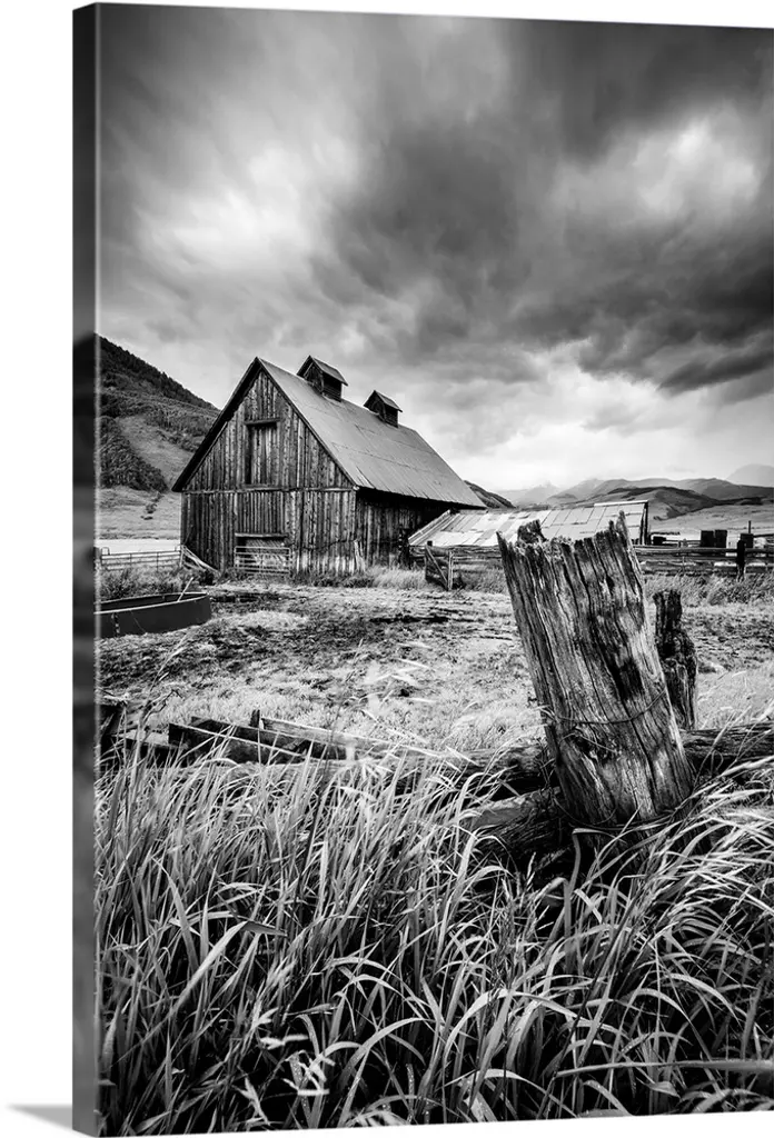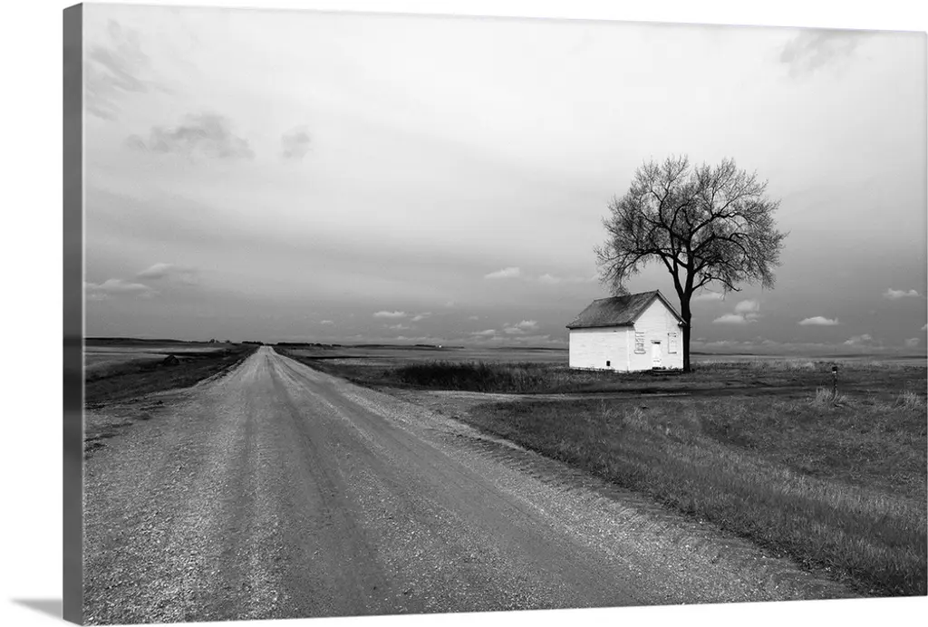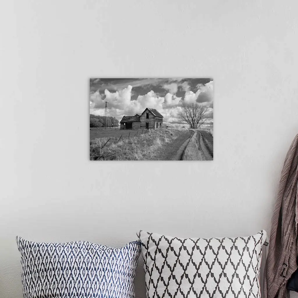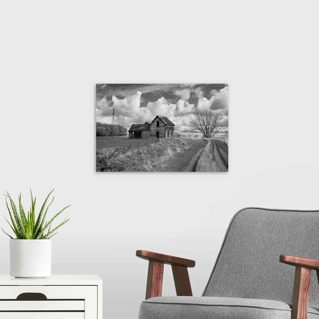 rural scene with old barn and farm track under cloudy sky in Rolette County USA