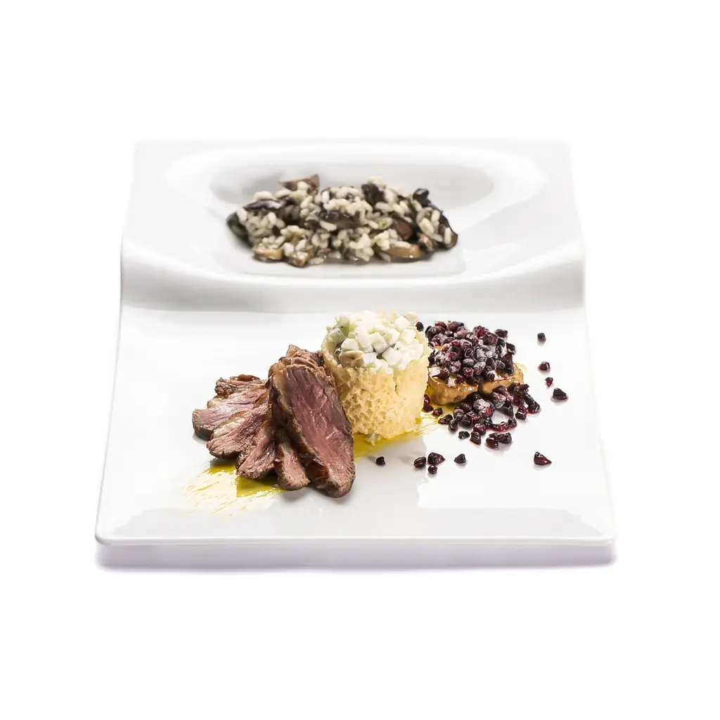 Vista Alegre’s focus on crafting plates for fine dining is highly regarded among acclaimed chefs, both at home and around the world. The Chef’s Collection exemplifies the concept of transforming simplicity into an enchanting visual experience. A remarkable addition to this collection is the Chef’s Collection Step Set, designed to elevate culinary presentations. This set features a sleek rectangular shape with a step-like structure, creating a stylish platform for food presentation. The step not only accommodates small bowl-shaped forms to hold the food but also serves as a practical food tray, adding functionality to its elegant design.