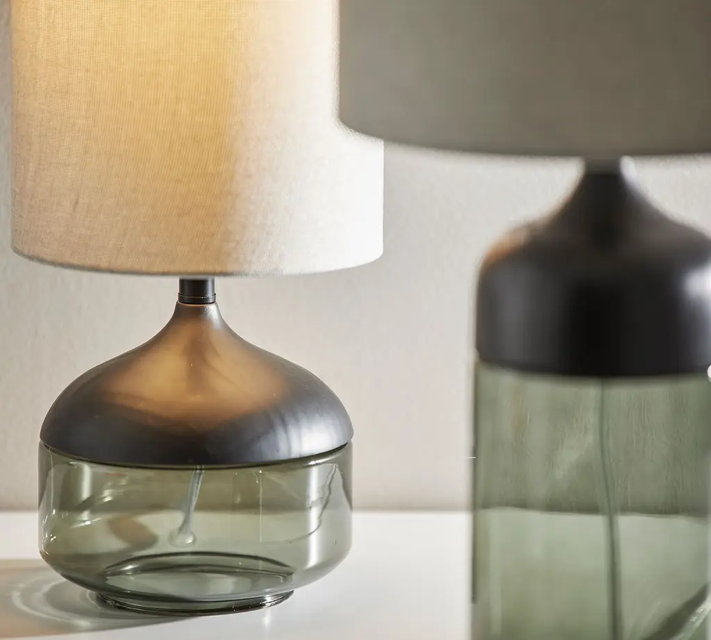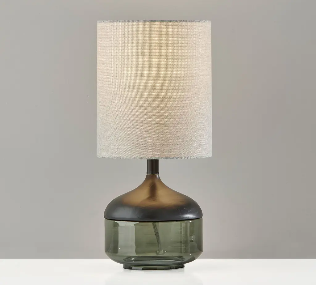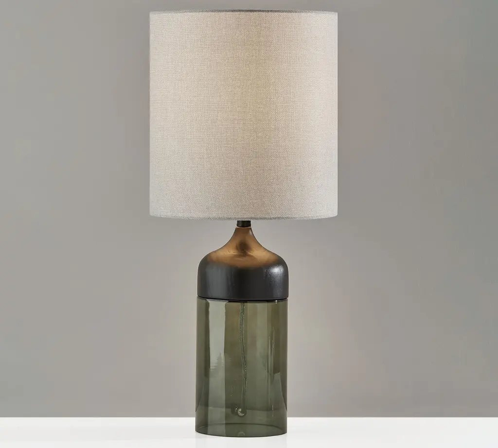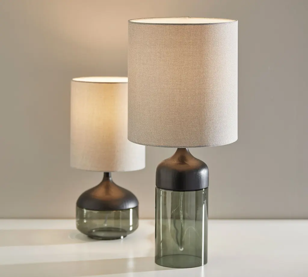 These gorgeous lamps makes striking additions to the contemporary home. A sculptural base pairs black wood with smoked glass, which is topped off with a light-gray textural linen shade.