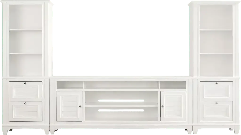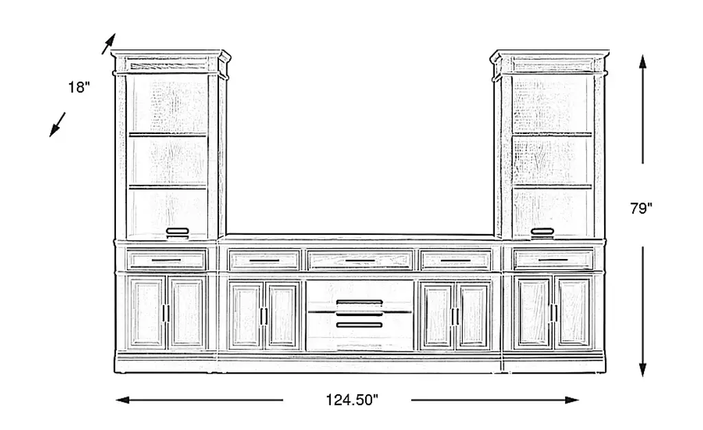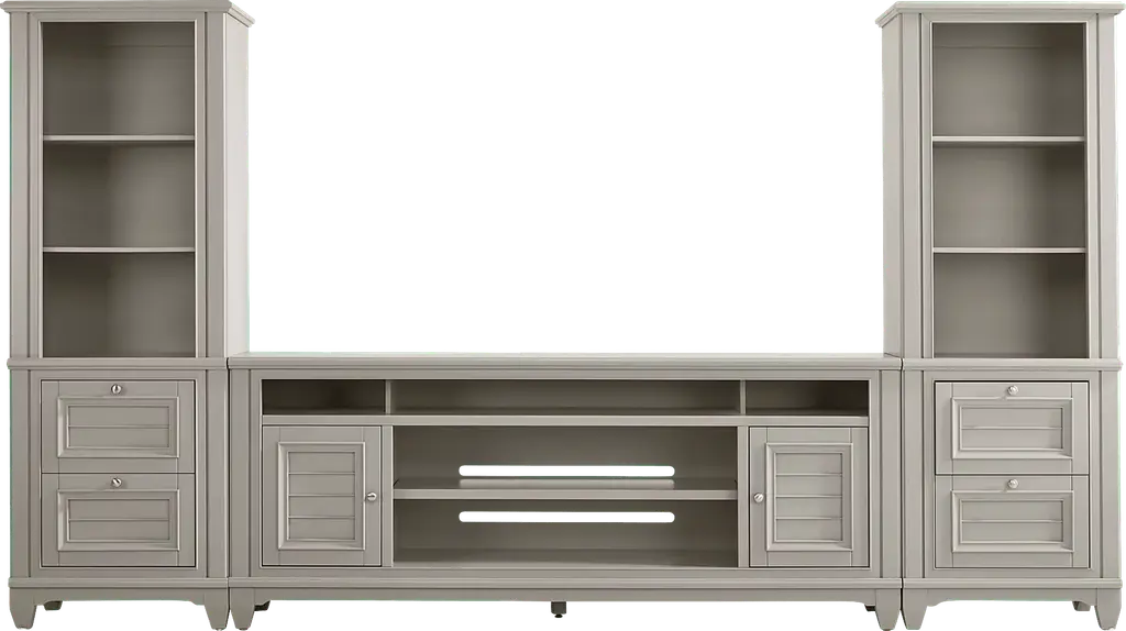 Transforming your space into a versatile hub of cinematic elegance, the Stephenson wall unit combines timeless allure with modern charm for irresistible appeal. This transitionally styled unit comes in a beautiful dark gray hue and offers plenty of storage space. At the center lies a 70" console, featuring three top felt-lined drawers and two-door cabinets on both ends for organized storage. Below the center drawer is an open shelf with wire management holes offering a clutter-free display space. A storage pier at each end provides an additional drawer and two-door cabinet along with three top shelves ideal for books, family photos and more. Behind each cabinet are wire management holes for a clutter-free set up. Sleek metal pulls in a silver finish adds a stylish final touch.