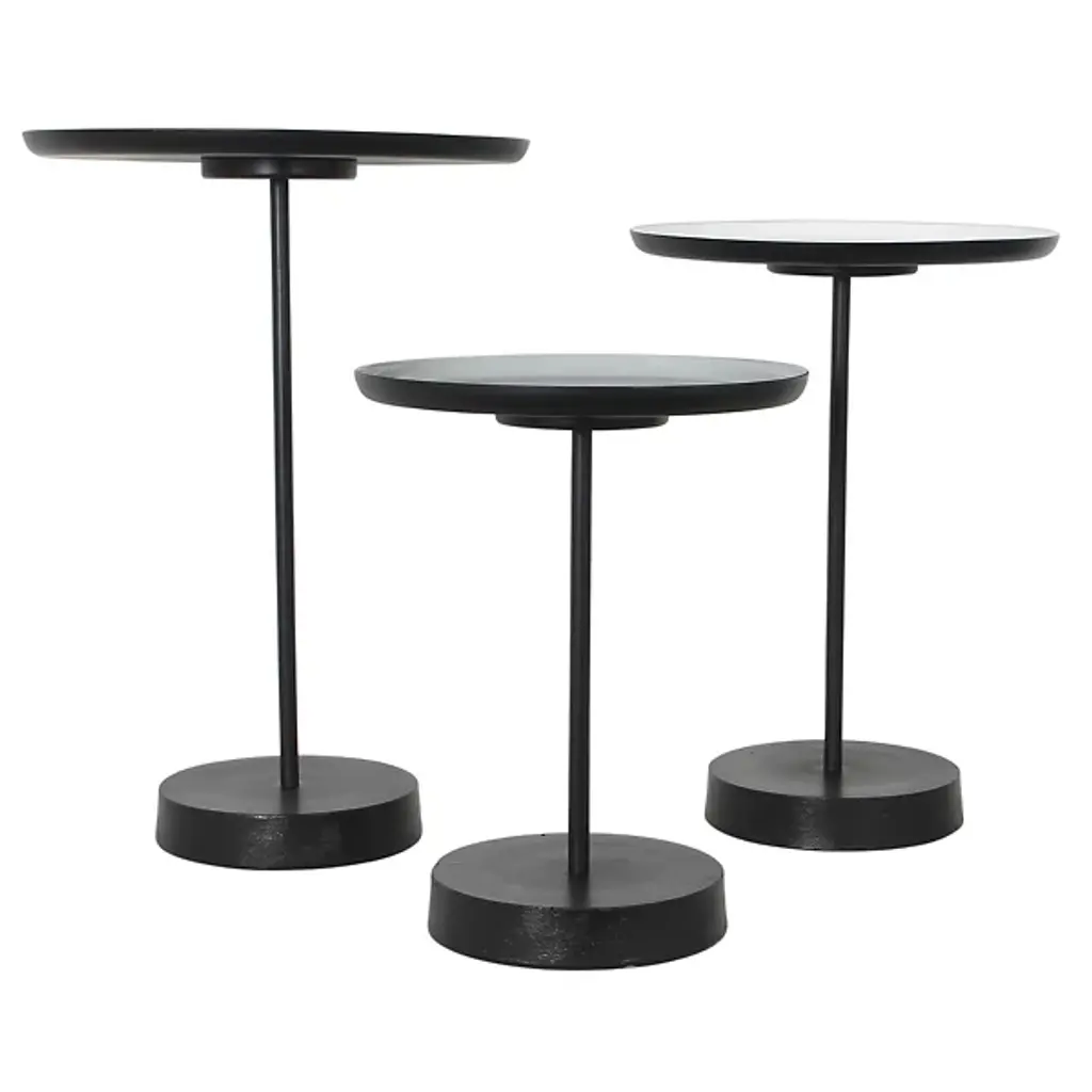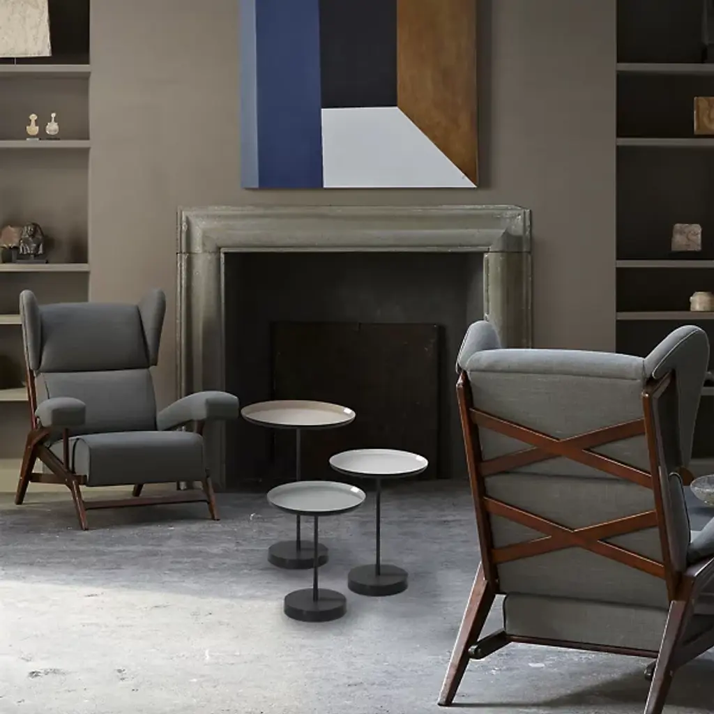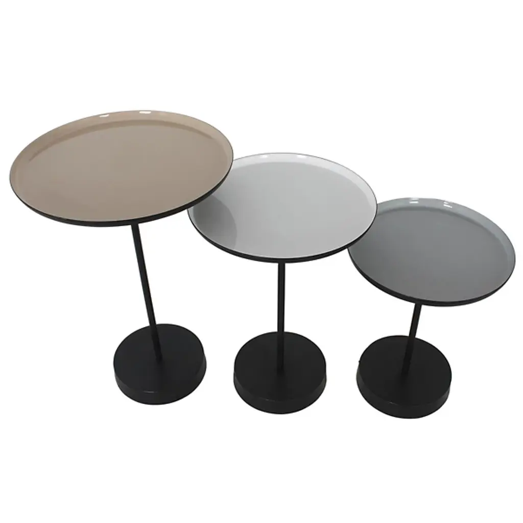 Add a stately, sculptural presence to interiors with the Stepping Stone Table, Set of 3 from Renwil. An inspired contemporary design with a memorable essential simplicity, each table rises from a circular base along a central stem, each table setting its top slightly higher than its neighbors. The powder-coated metal coordinates with each enameled center, while an outward-beveled rim retains any items set atop it. Each table is colored differently, with white, beige, and gray tops offering synchronized coordination as an ensemble.