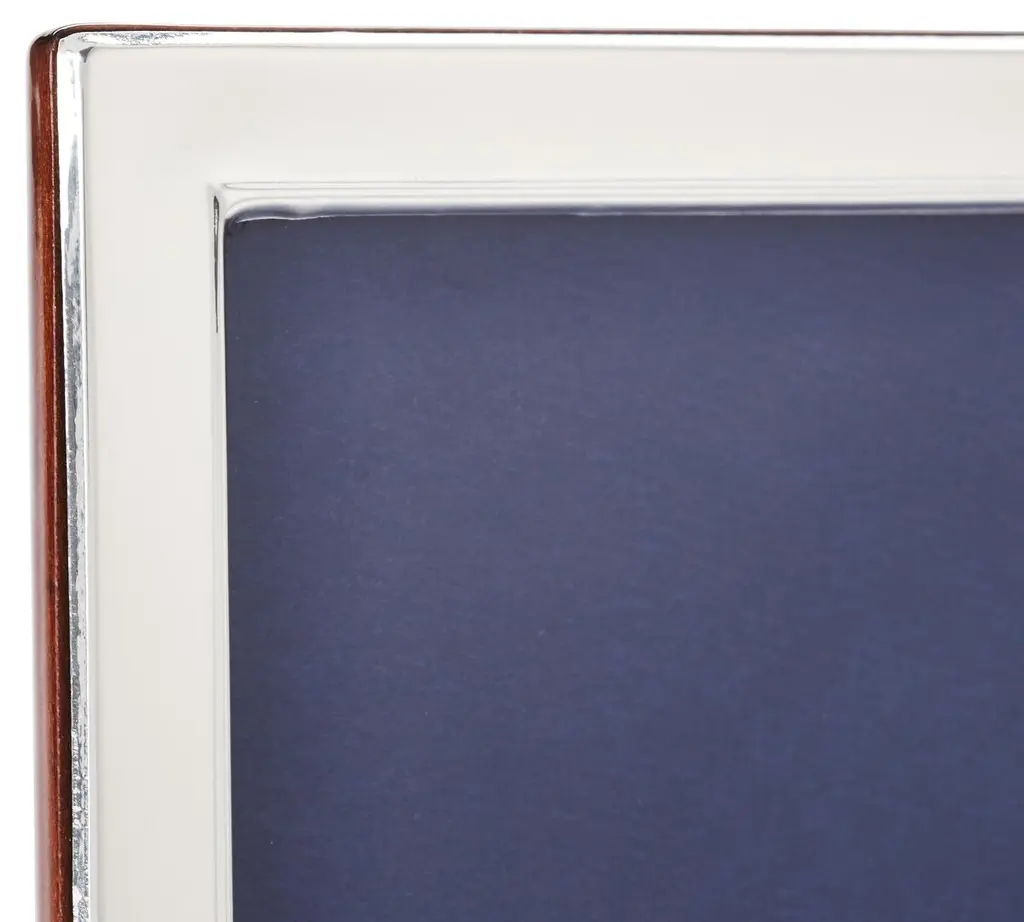 A narrow edge of pristine, shimmering sterling silver dresses up this simple, streamlined frame. The design also features a beautiful wood back. Can be used horizontally or vertically. Made in Italy.