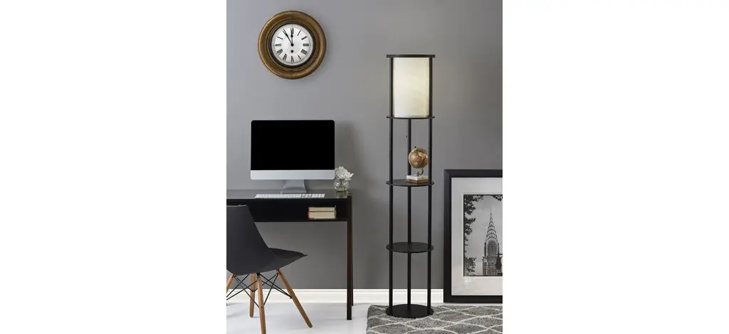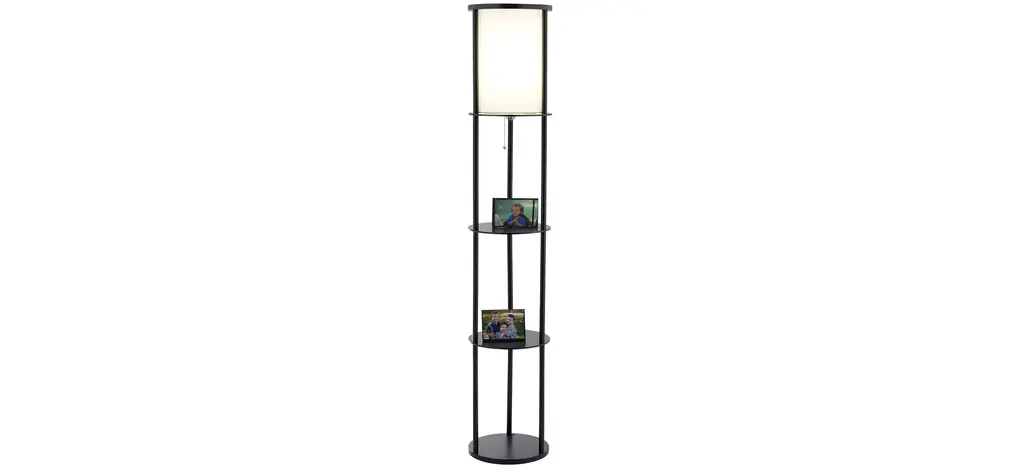 The Stewart Round Shelf Floor Lamp is a sensible addition to soft contemporary decor offering functional storage and generous illumination. A simple black finish makes the Stewart Floor Lamp an easy accessory to integrate into contemporary or transitionally styled living rooms, bedrooms or home offices. Its compact profile is perfect for smaller apartments or any living space that requires a dual-purpose accent. A white fabric shade reveals an elegant texture when lit. With 2 storage shelves and functional wire clips that create a clean look, this item is a no brainer.