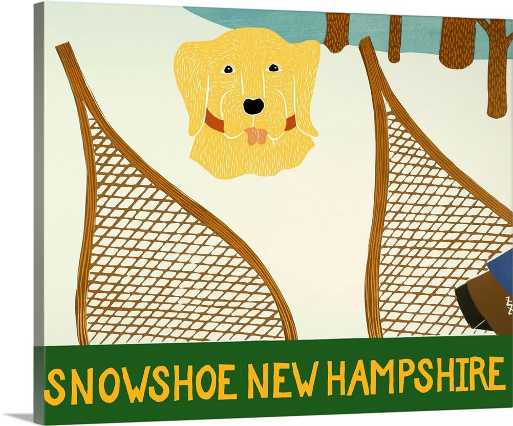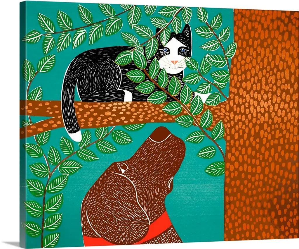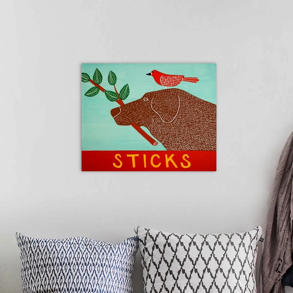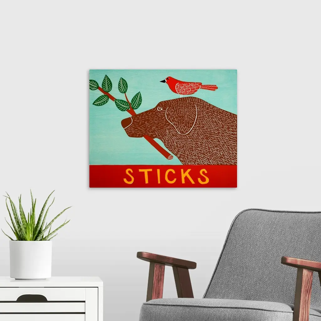 Illustration of a chocolate lab with a red bird standing on its head and a leafy stick in its mouth.