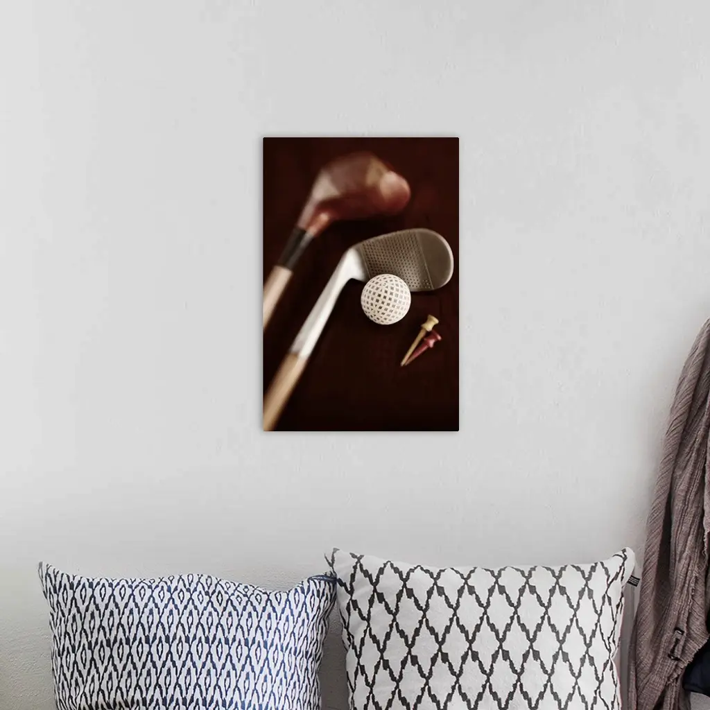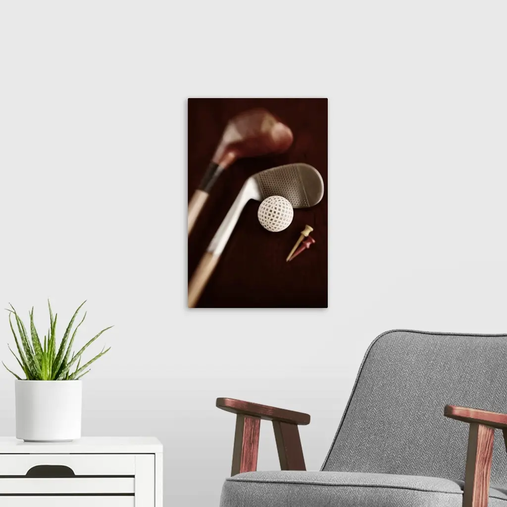 Still Life Of Vintage Golf Clubs, Tees And Ball