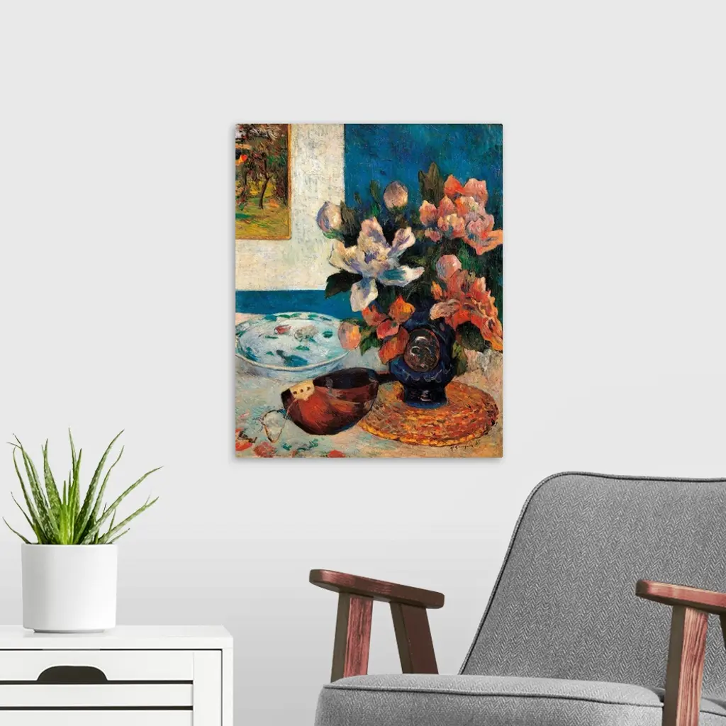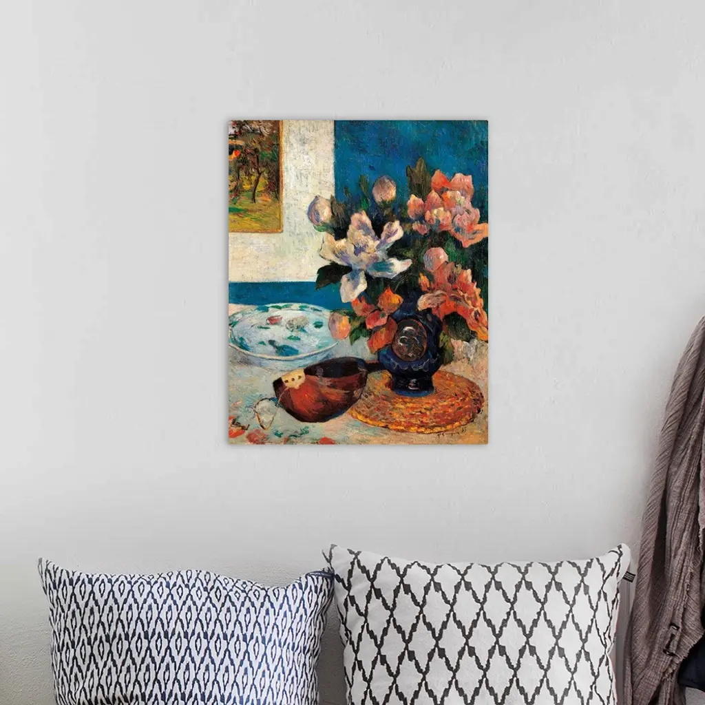 Still Life with a Mandolin, by Paul Gauguin, 1885 about, 19th Century, oil on canvas, cm 61 x 51 - France, Ile de France, Paris, Muse dOrsay, MNR219. All. Still life mandolin table tablecloth room plate vase containers flowers blue picture. (251227) Evere