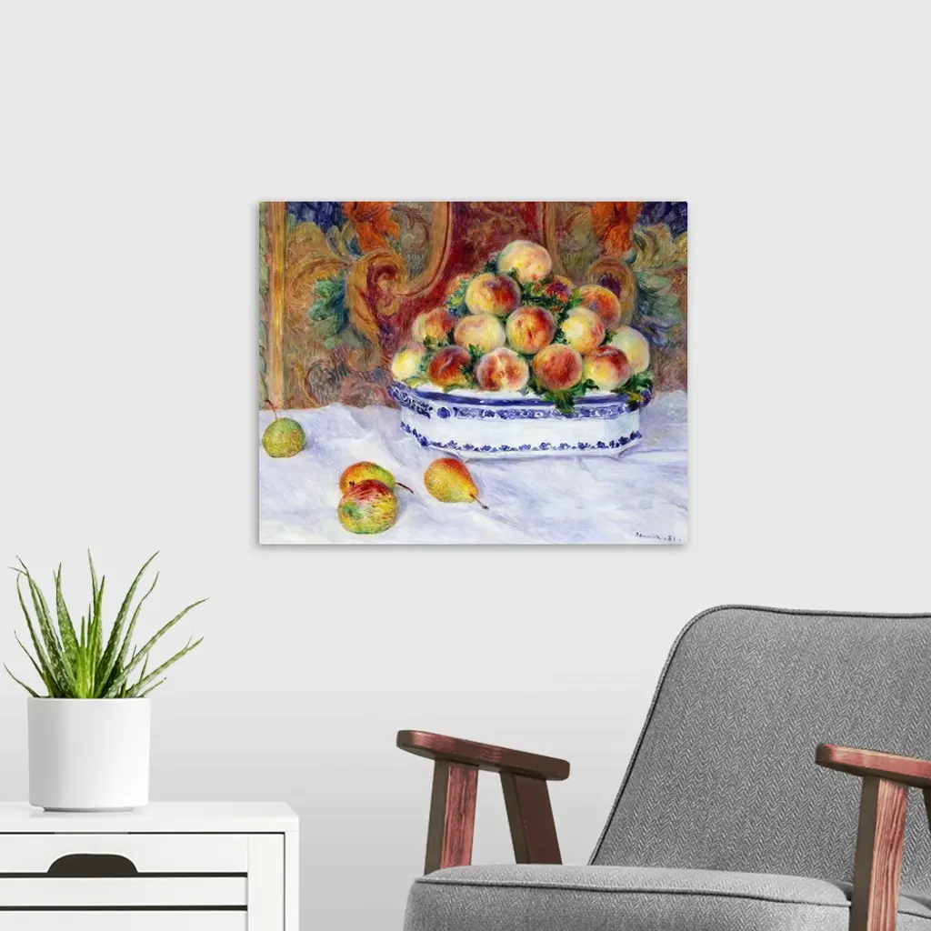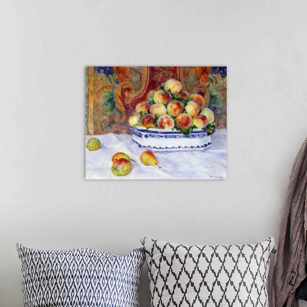 Reviewers of the 1882 Impressionist exhibition were dazzled by this very appealing still life of a certain fruit bowl of 'Peaches,' whose velvety execution verges on a trompe l'oeil. Painted the previous summer at the country house of Renoir's patron Paul Berard, it is one of two still lifes that feature the same faience jardiniere; the other version also belongs to the Metropolitan Museum.