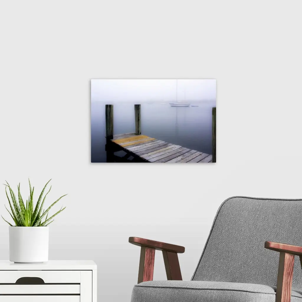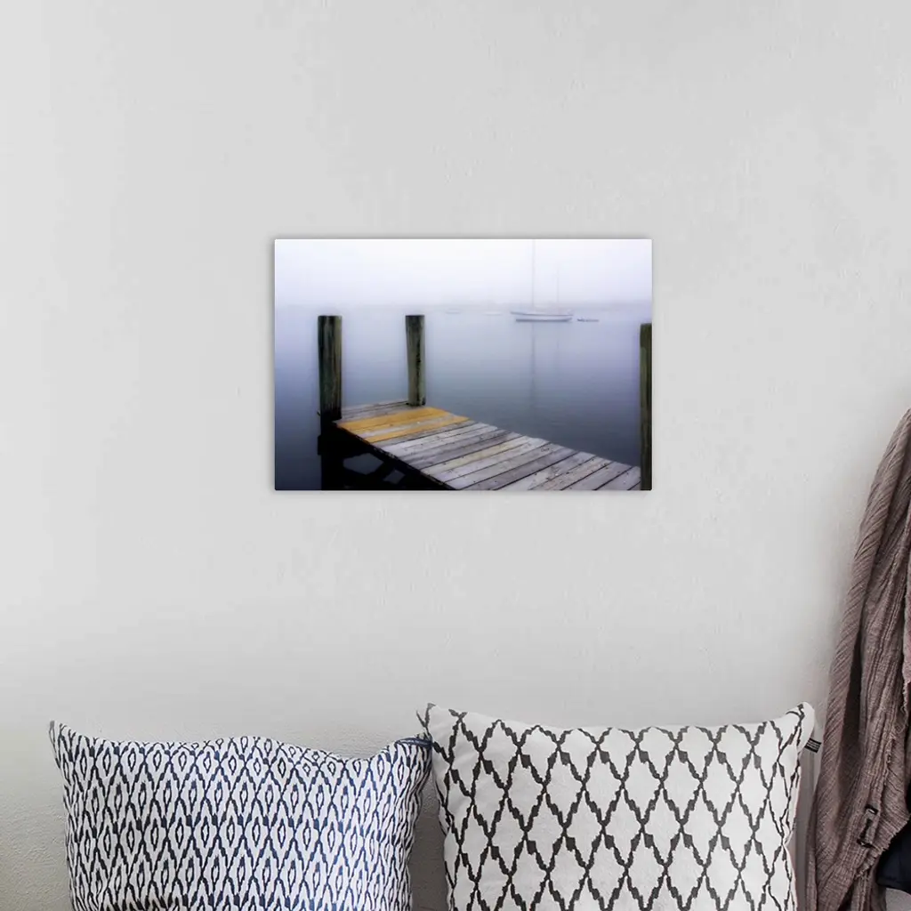 Giant, horizontal wall picture of a wooden dock leading into calm water, several boats can be seen in the foggy background.