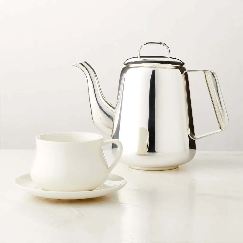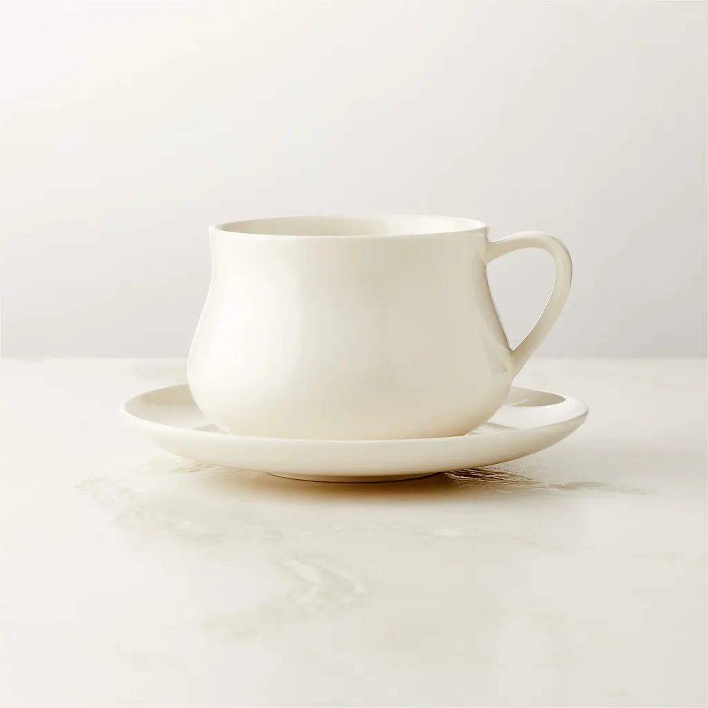 Designed by Veronica Balutto of the Italian design studio Balutto Associati, new bone china teacup and saucer elevates the morning tea/coffee ritual. Made without bone ash, new bone china is lightweight, with the bright white hue of traditional bone china. Gently rounded silhouette lends an effortless elegance to both casual and formal settings. CB2 exclusive.